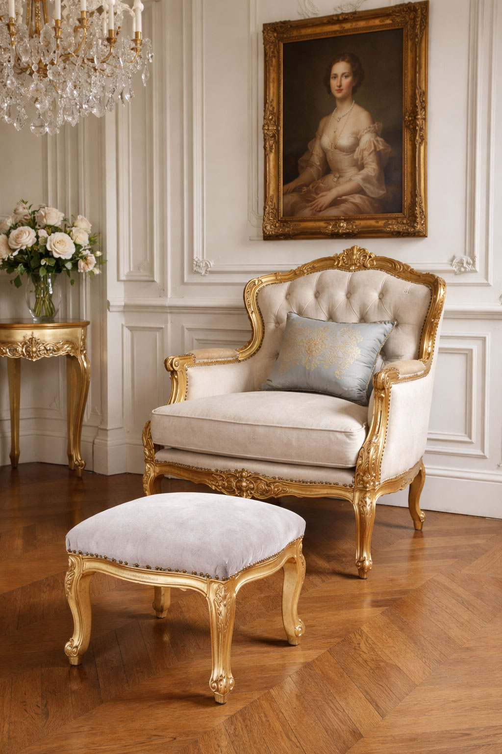 Ob als eleganter Fußschemel im Wohnzimmer, als Beistellhocker im Schlafzimmer oder als luxuriöse Ergänzung zu Chaiselongue, Schminkkommode oder Barock-Sessel – „Chateau Monfort“ bringt königlichen Glanz in jedes Interieur.