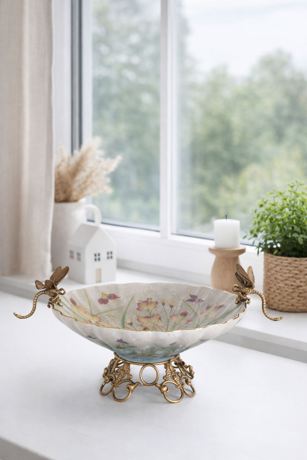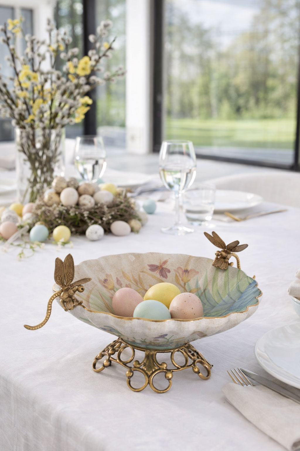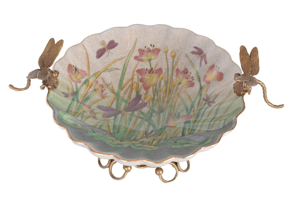 Besonderer Blickfang sind die kunstvoll gestalteten Libellen aus Bronze, die als dekorative Schalenhenkel ausgeführt sind und dem Objekt eine lebendige, organische Anmutung verleihen.