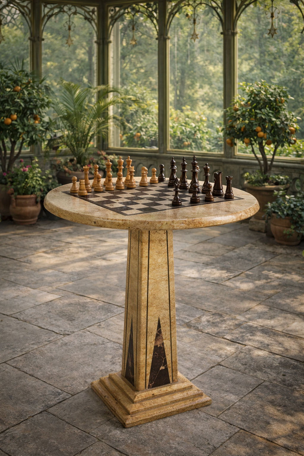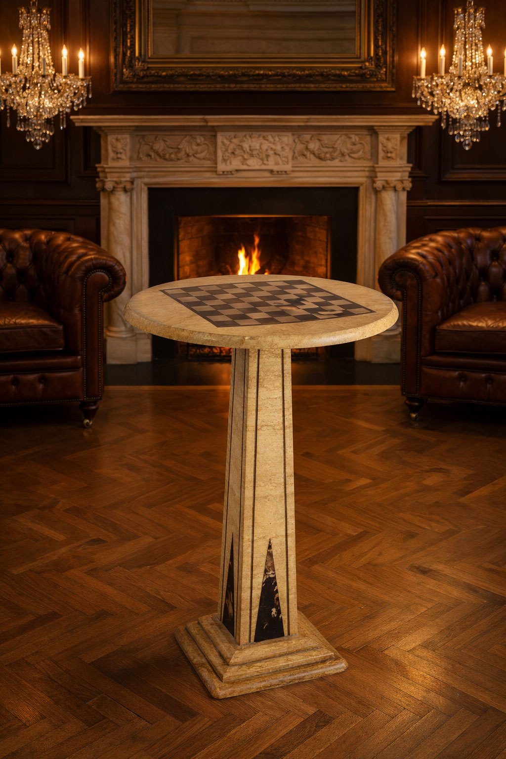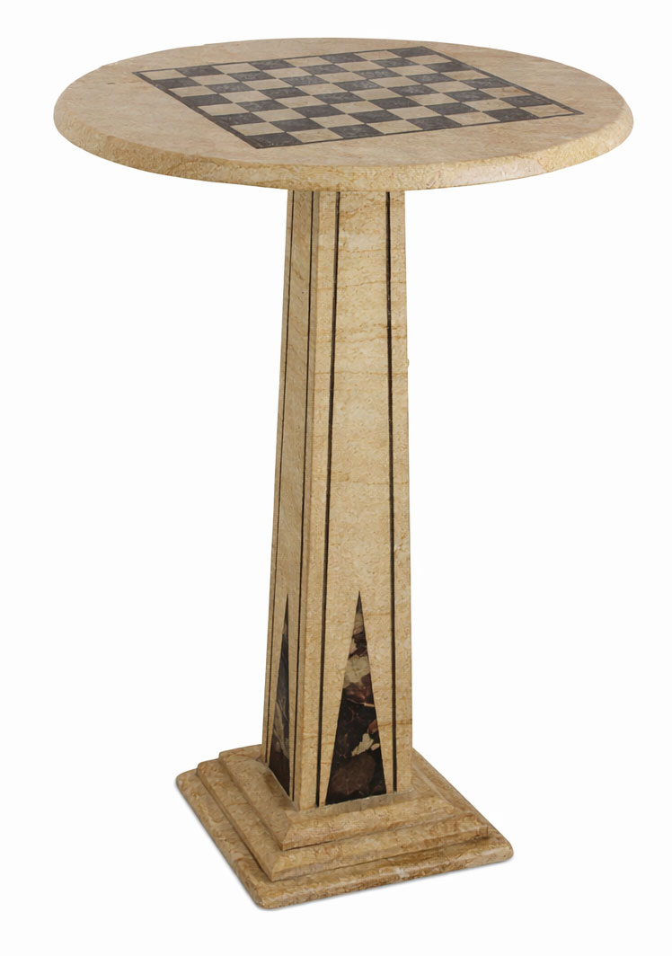 Gefertigt in sorgfältiger Handarbeit, präsentiert sich der Tisch mit einer edlen Marmorplatte, in die ein klassisches Schachbrett kunstvoll eingearbeitet ist.