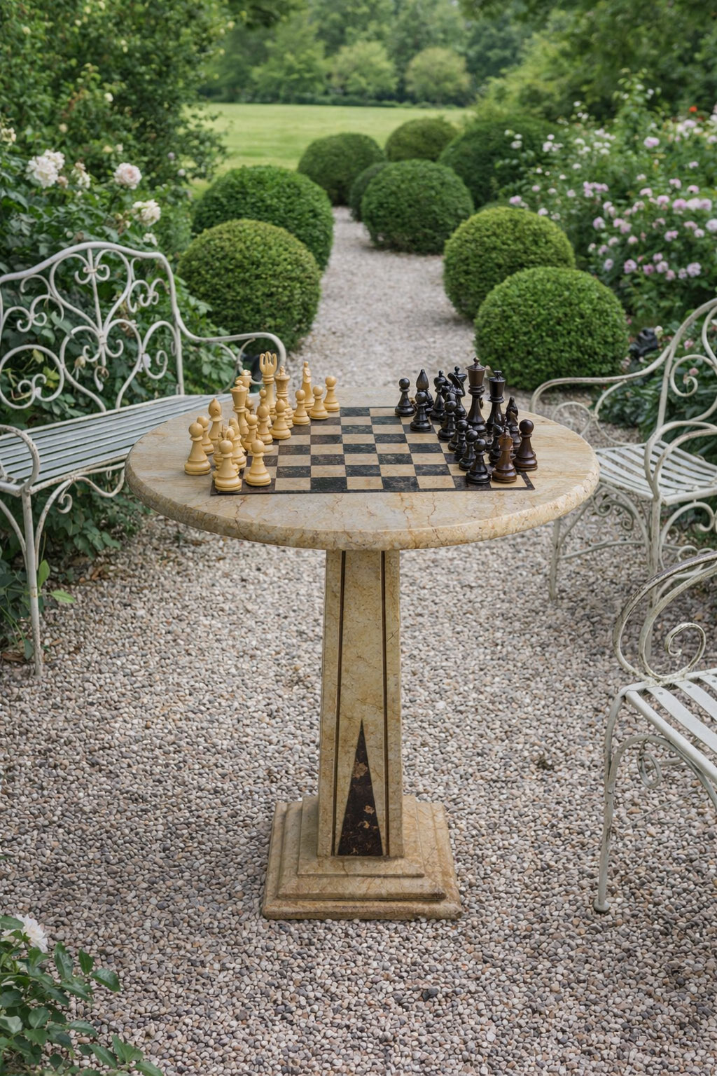 Ein nostalgischer Gartenspieltisch mit edler Marmorplatte und integriertem Schachbrett. Der runde Tisch „Villa Rothschild“ vereint klassische Eleganz, Handwerkskunst und spielerischen Charme – ein dekoratives Unikat für Haus und Garten.