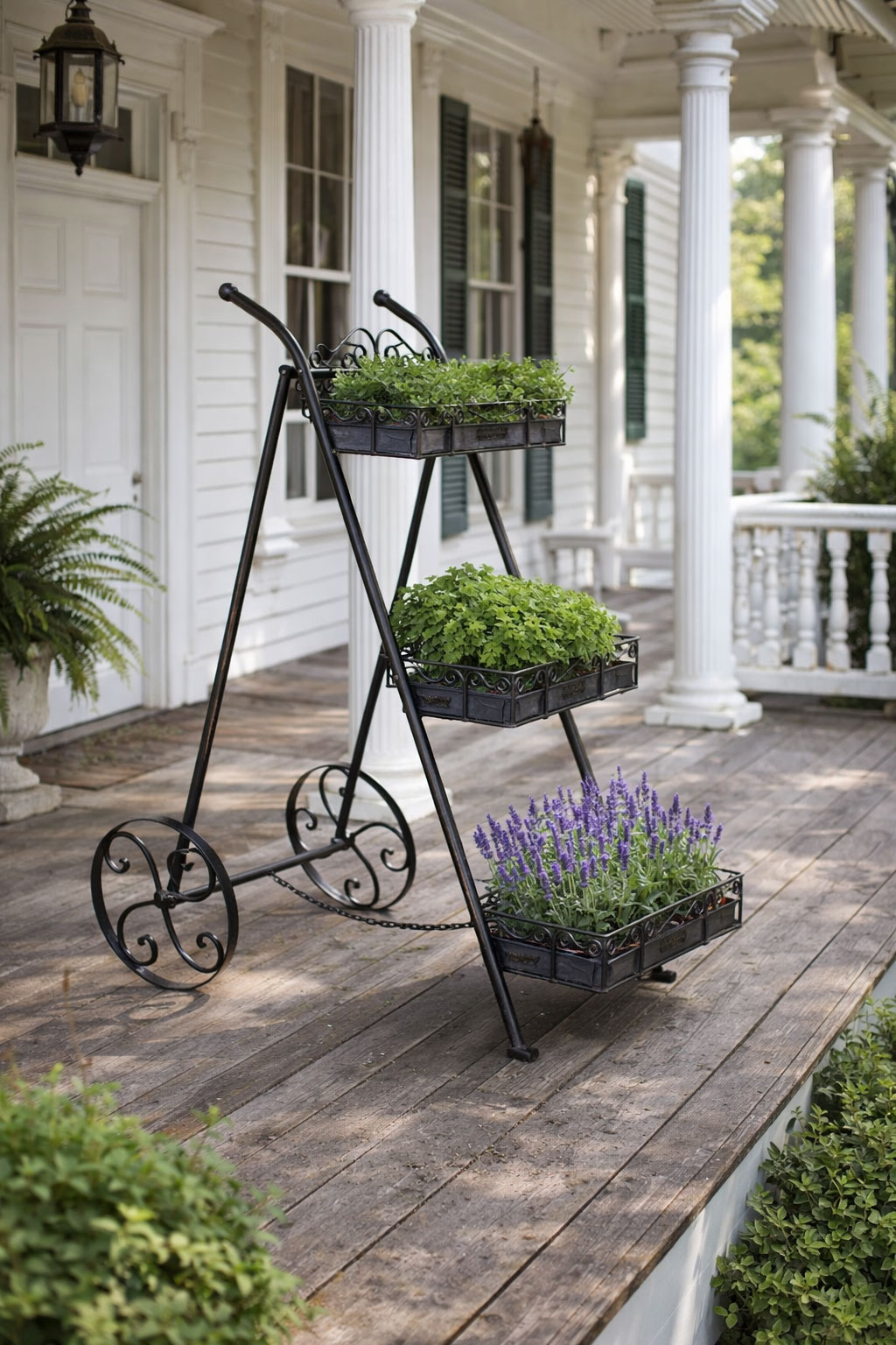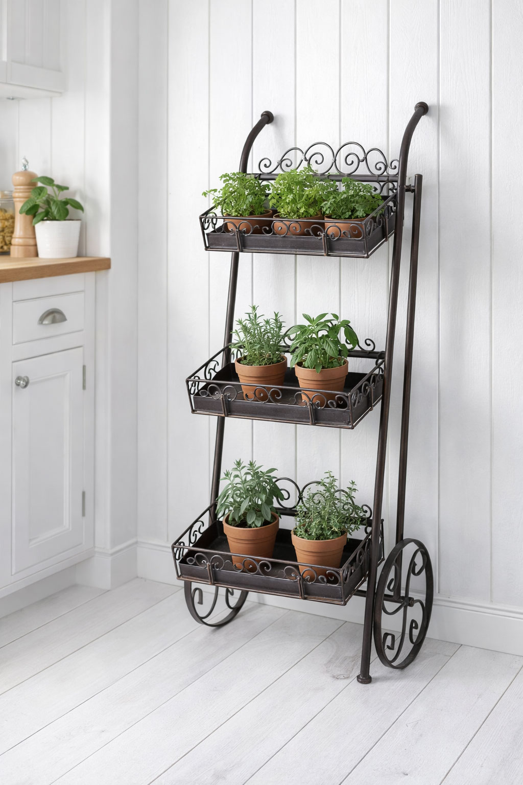 Die aus lackiertem Eisen gefertigte Konstruktion bietet auf drei Ebenen ausreichend Platz für Kräutertöpfe, Blumenarrangements oder dekorative Accessoires. Die herausnehmbaren Blumenkörbe ermöglichen flexible Gestaltungsmöglichkeiten und sind besonders praktisch beim Bepflanzen oder Reinigen.