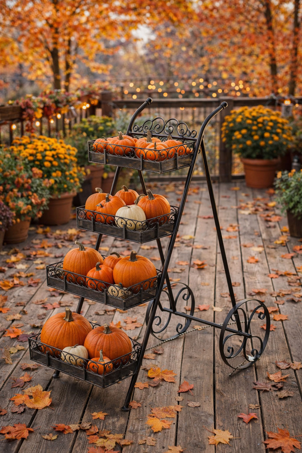 Romantische Pflanzentreppe aus Eisen im Vintage-Stil mit drei Ebenen. Herausnehmbare Körbe, klappbar & mobil dank Rädern. Höhe ca. 110 cm, ideal für Balkon, Garten oder Wintergarten. Ohne Dekoration
