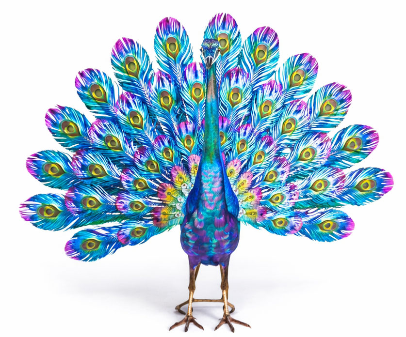 Jedes einzelne Federdetail ist sorgfältig ausgearbeitet und verleiht dem Pfauenhahn Lebendigkeit, Ausdruck und eine beeindruckende Präsenz.