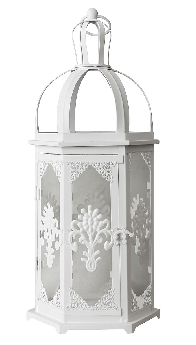 Gefertigt aus weiß lackiertem Eisen mit rundum Glaseinsätzen, bietet die große Laterne Platz für eine Kerze oder Stumpenlicht, das im Inneren sanft flackert und warmes Licht verbreitet.