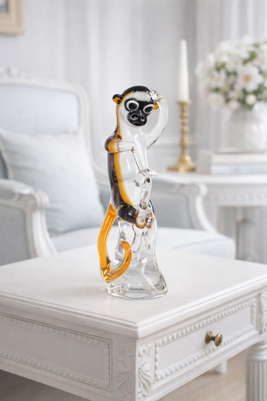 Als dekoratives Kunstobjekt oder besonderes Sammlerstück verbindet „Monkey“ nostalgischen 50er-Jahre-Charme mit hochwertiger Murano-inspirierter Glaskunst.