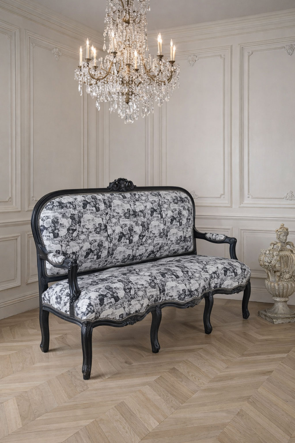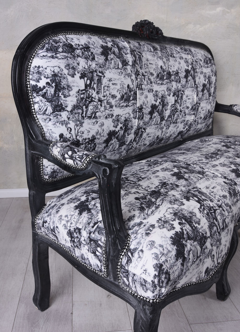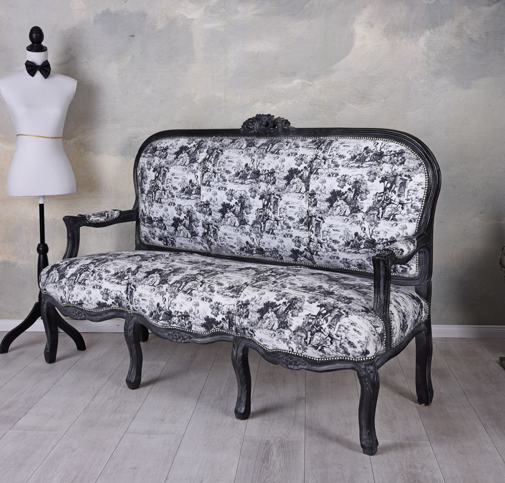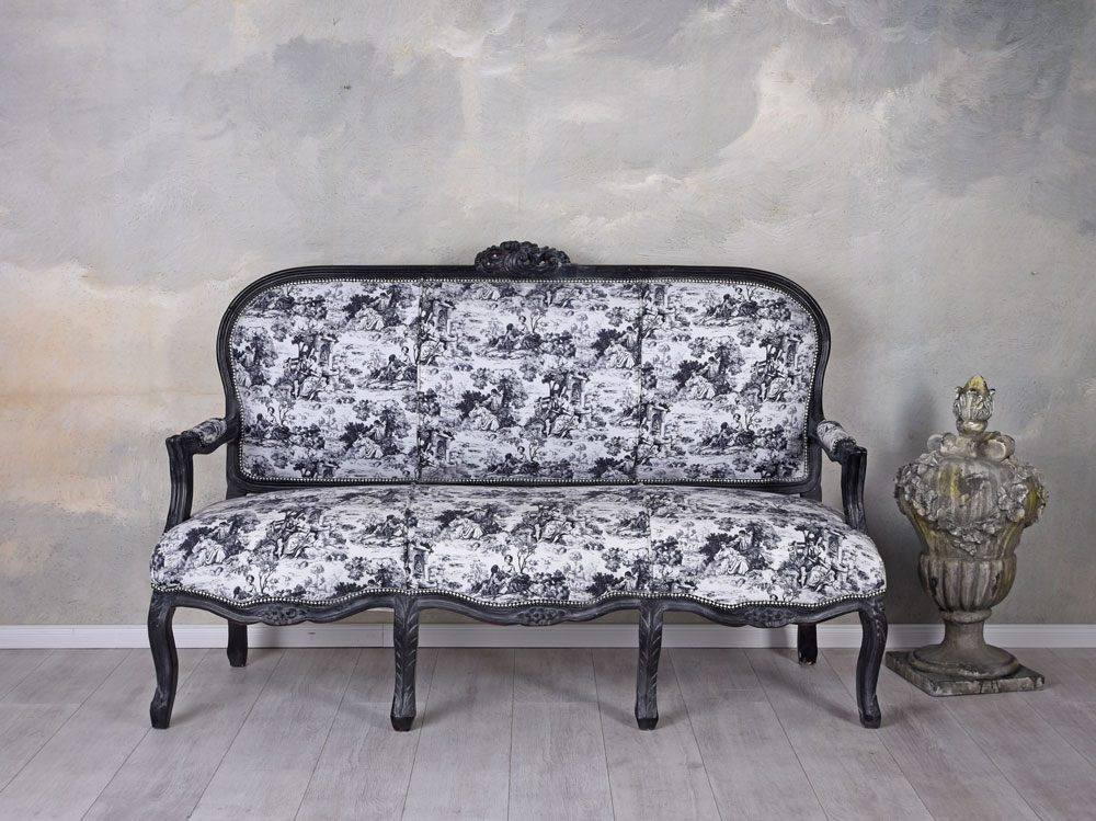Ein eleganter Toile-de-Jouy-Bezug trifft auf ein tiefschwarz gefasstes, kunstvoll geschnitztes Holzgestell und verleiht dem Barockdesign eine edle, zugleich kultivierte Ausstrahlung.