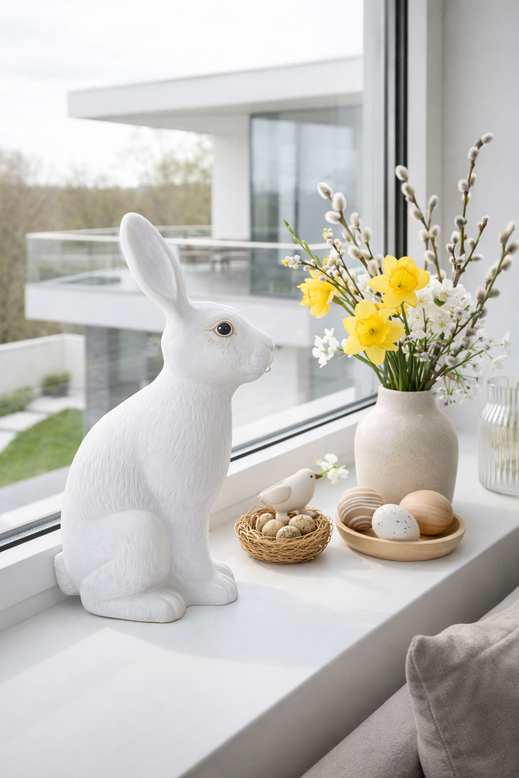Die Figur eignet sich ideal als stilvolle Osterdekoration, macht aber ebenso ganzjährig als dekoratives Element im Wohnbereich, Wintergarten oder geschützten Außenbereich eine ausgezeichnete Figur.