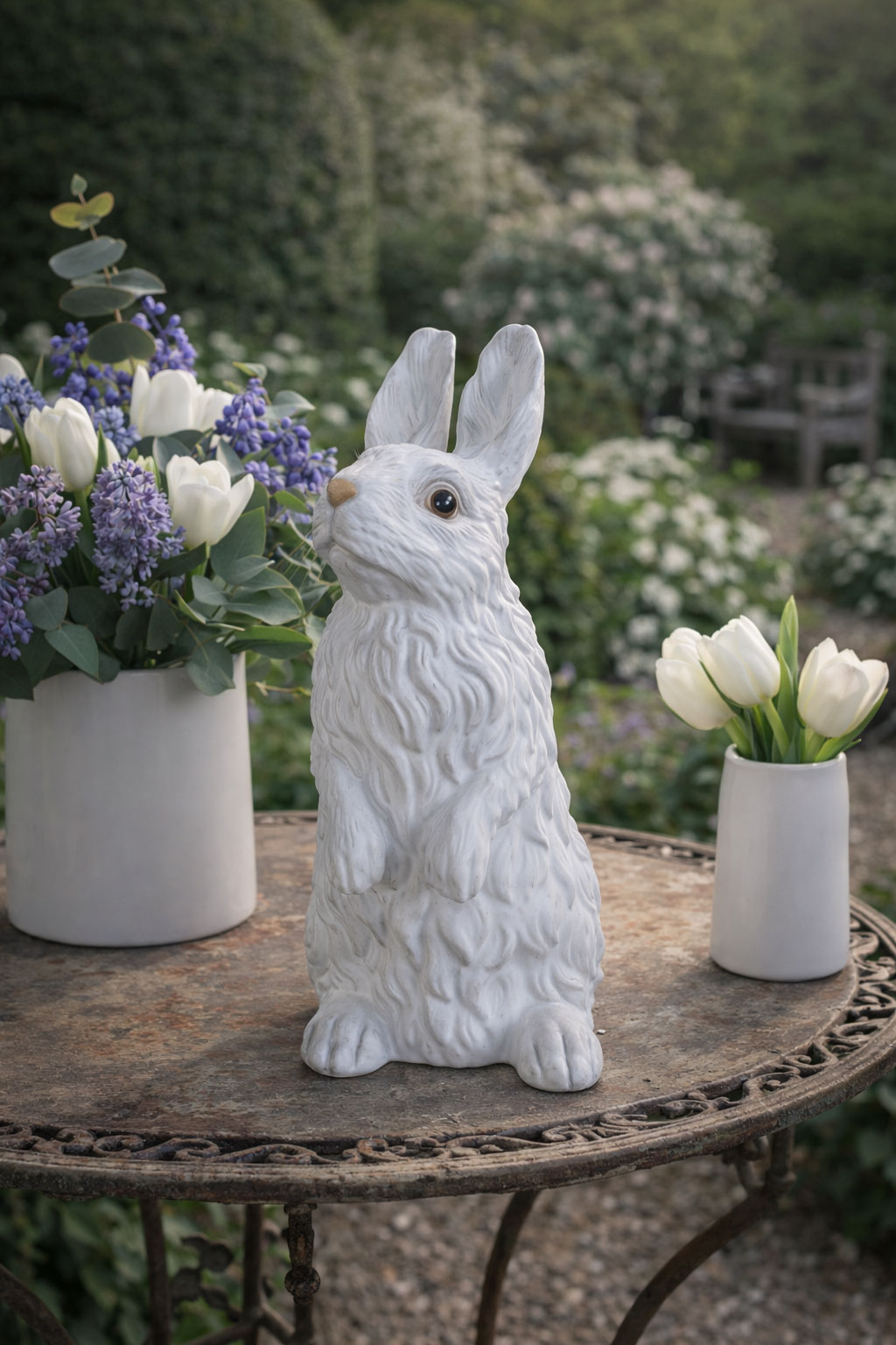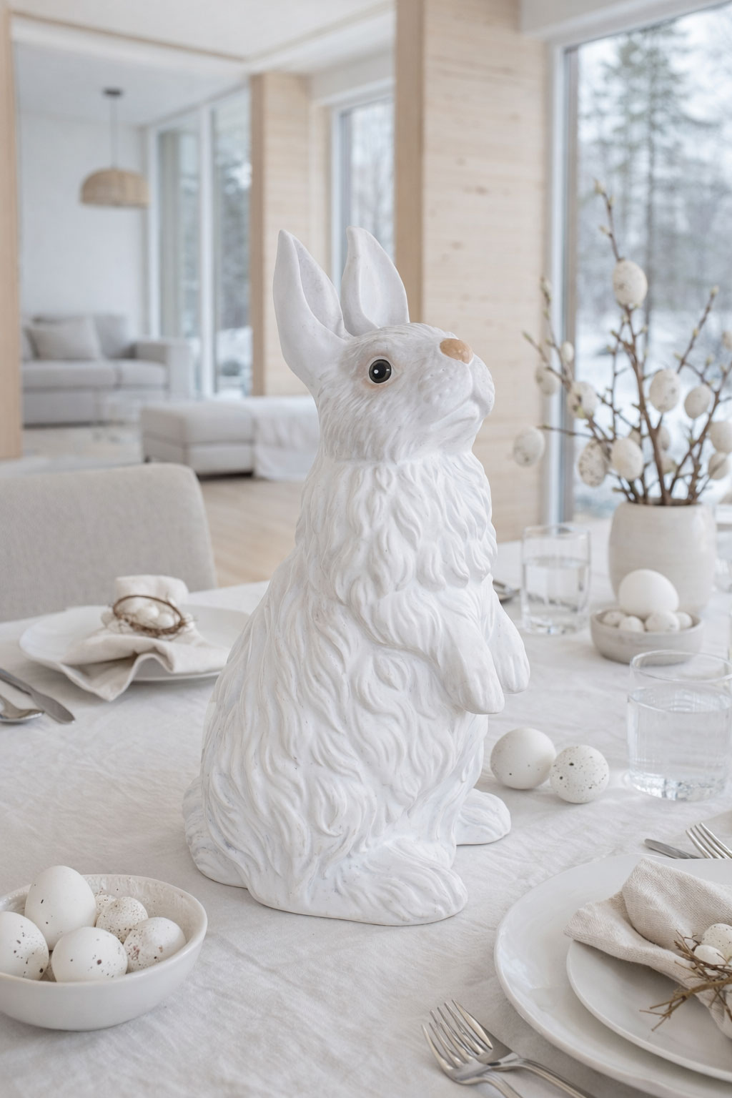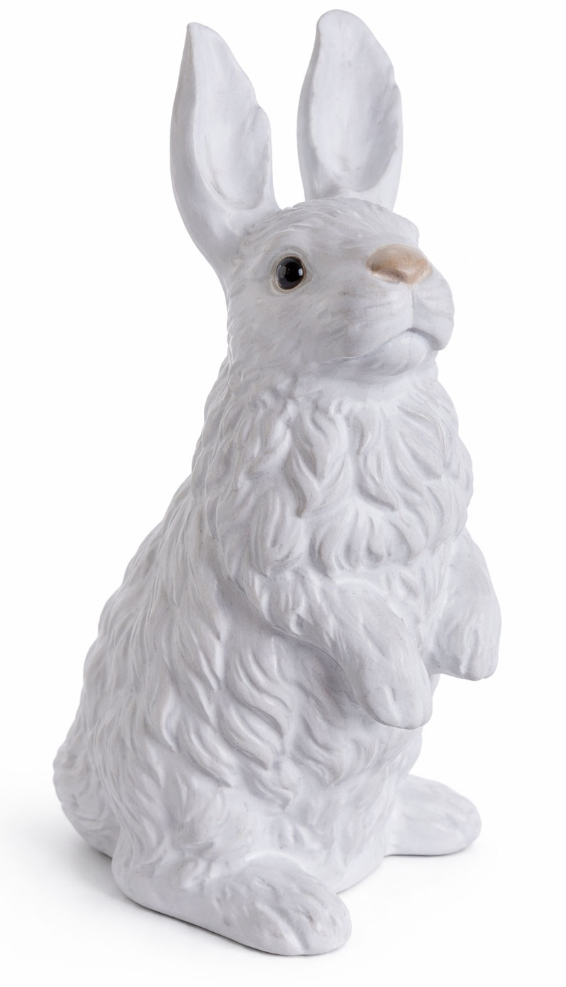 Die neutrale weiße Farbgebung macht das Kaninchen zu einem vielseitigen Dekorationsobjekt, das sich hervorragend mit anderen Wohnaccessoires kombinieren lässt.