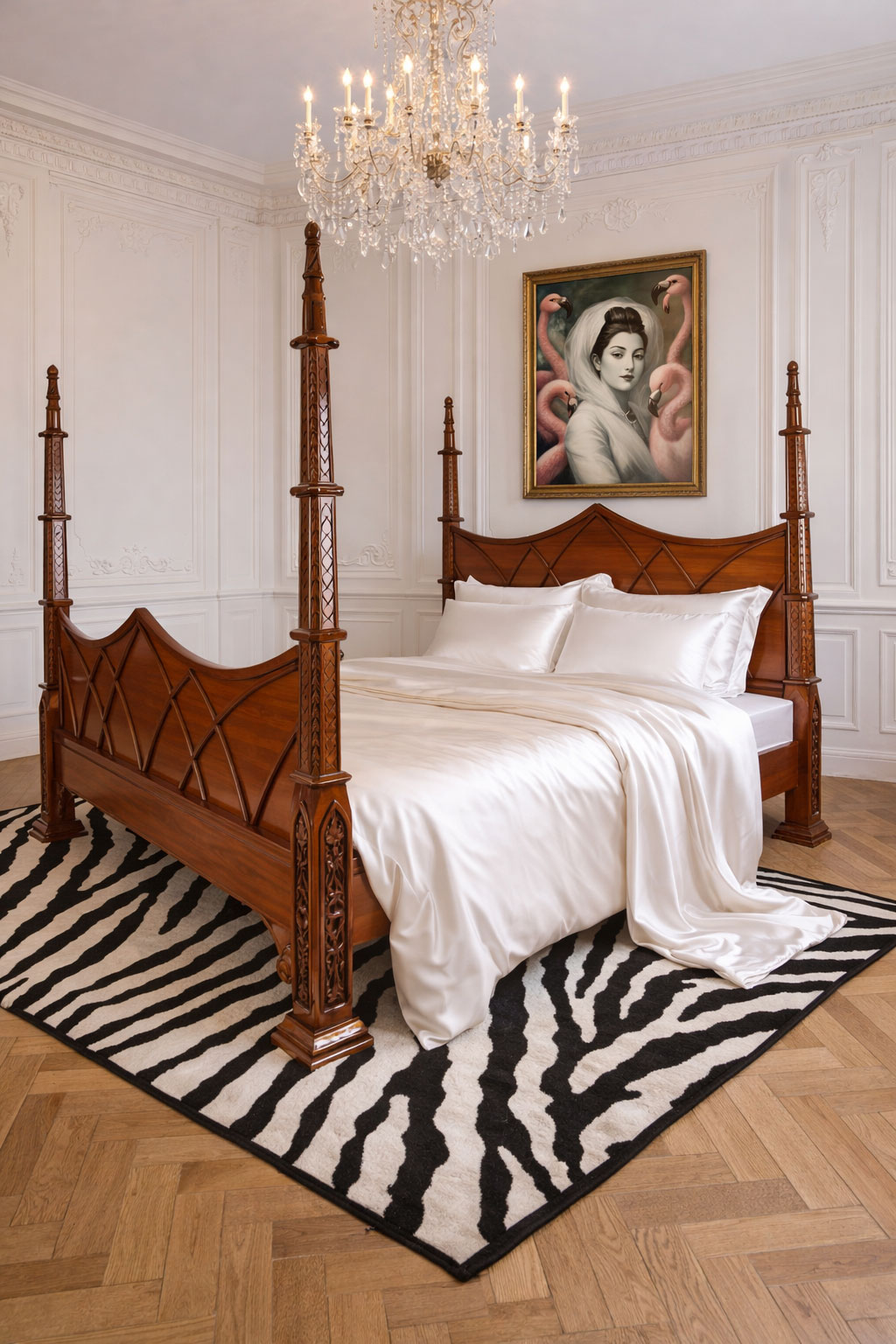 Das Himmelbett „Villa Galadriel“ vereint gotische Pracht, massives Mahagoniholz und vier imposante Säulen zu einem majestätischen Schloss-Statement.