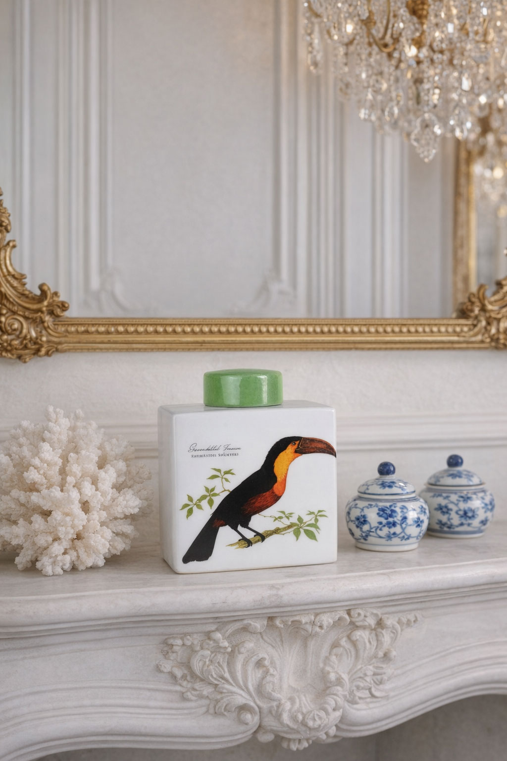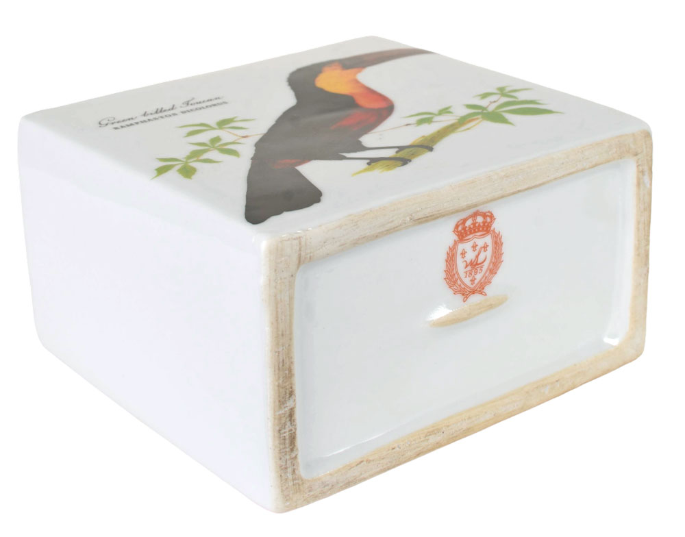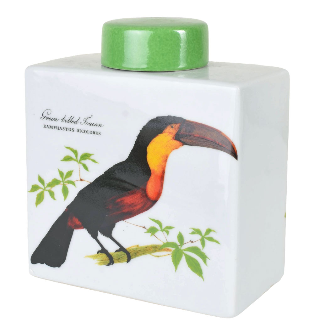 Dekorative Porzellan-Deckeldose im Antik-Stil mit Tukan & rotem Papagei – 14,5 cm hoch, charmant & vielseitig verwendbar.