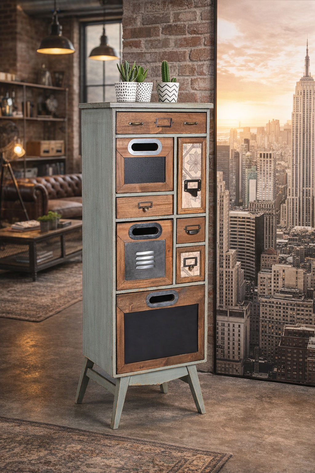 Schlanke Industrial Hochkommode aus Holz & Metall mit acht Schubladen im Patchwork-Stil. Die „LOFT WOHNUNG“ verbindet Vintage-Charme mit funktionalem Stauraum – ideal für Wohn- und Arbeitsbereiche.