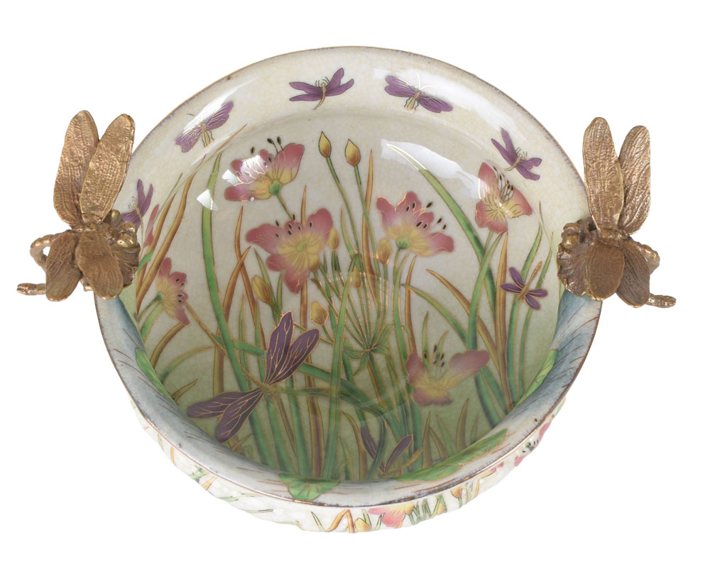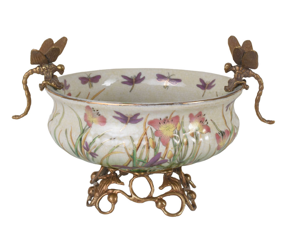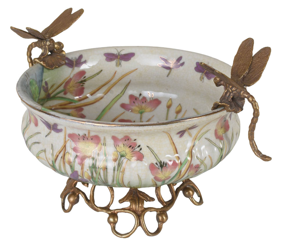 Diese luxuriöse Krakelee-Schale mit Libellen ist eine prachtvolle Hommage an den romantischen Jugendstil und vereint kunstvolle Porzellanmalerei mit schweren Bronzemontierungen von beeindruckender Detailtiefe.