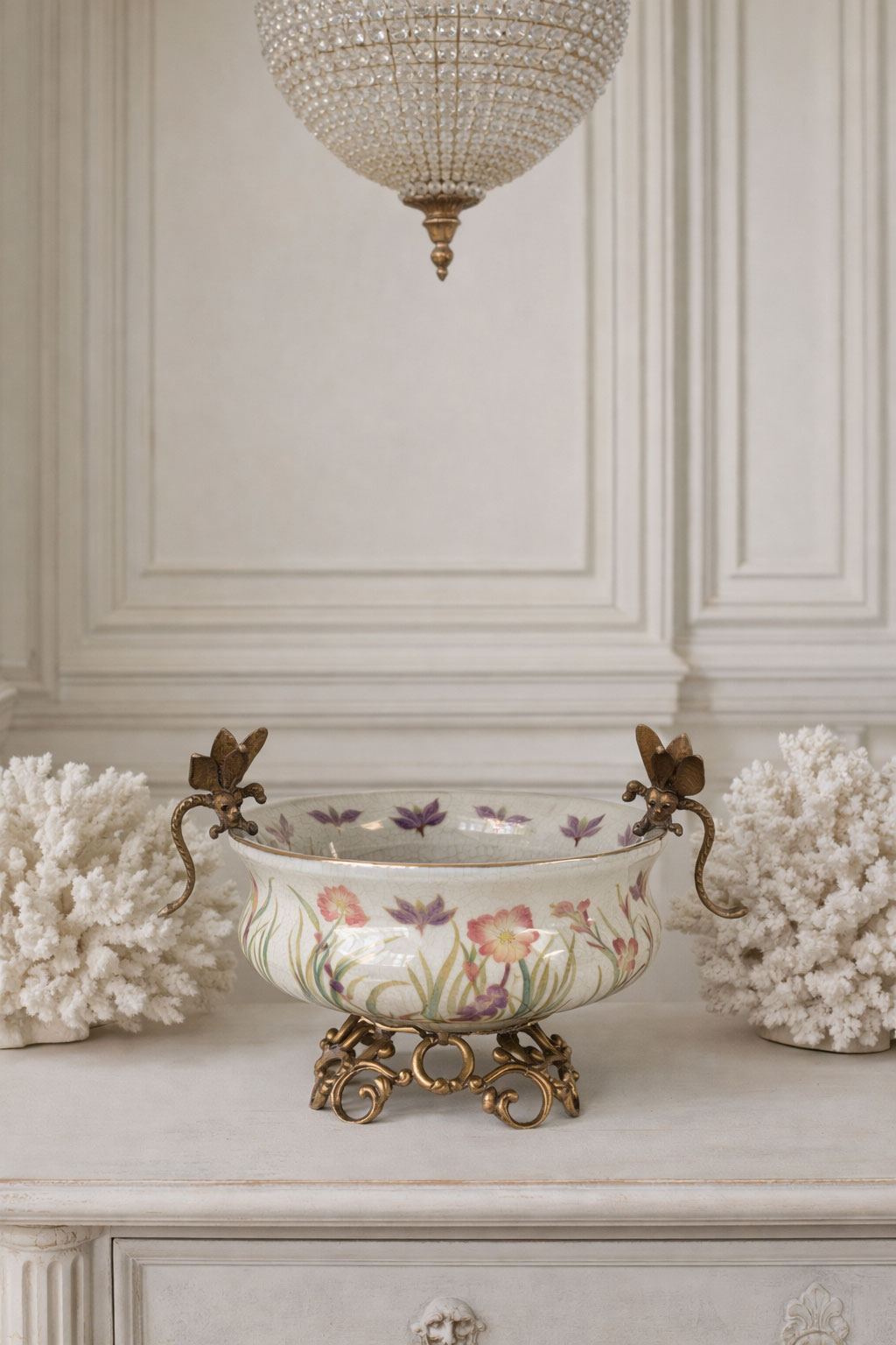 Der fein krakelierte Porzellankorpus im antikisierenden Stil ist von Hand bemalt und zeigt zarte Schmetterlinge sowie sommerliche Blütenmotive, die dem Objekt eine poetische Leichtigkeit verleihen.