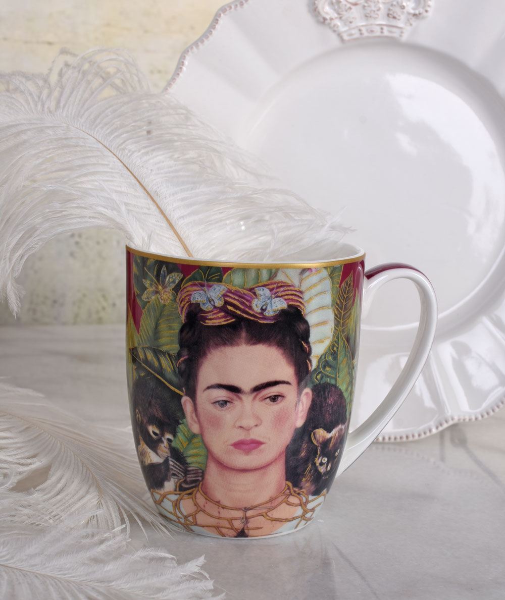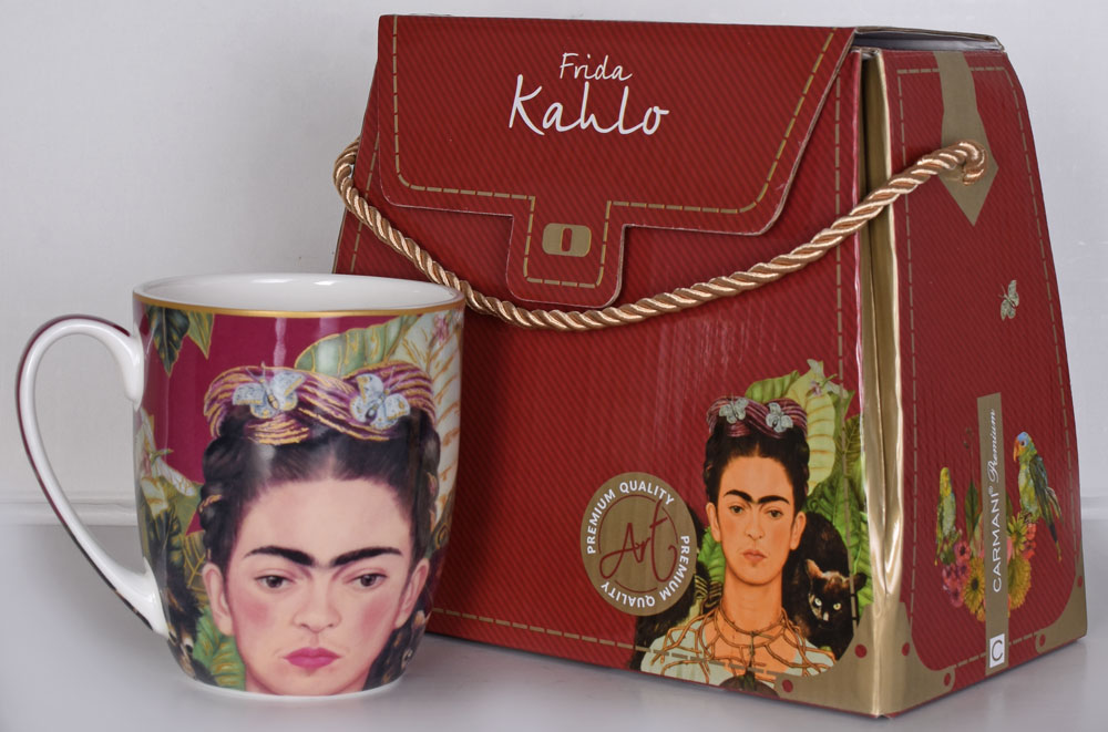 Porzellanbecher FRIDA KAHLO – farbenfrohe Tasse mit Selbstporträt um 1940, inkl. Geschenkbox, Original Carmani – kunstvolles Sammlerstück.