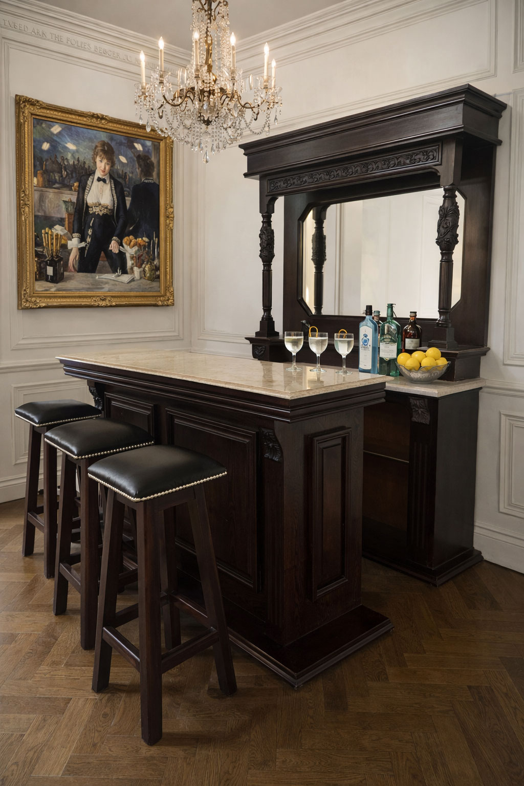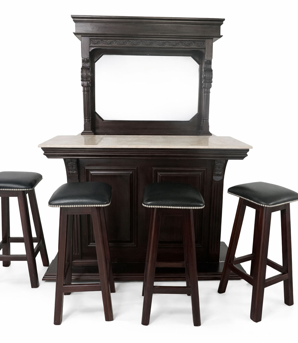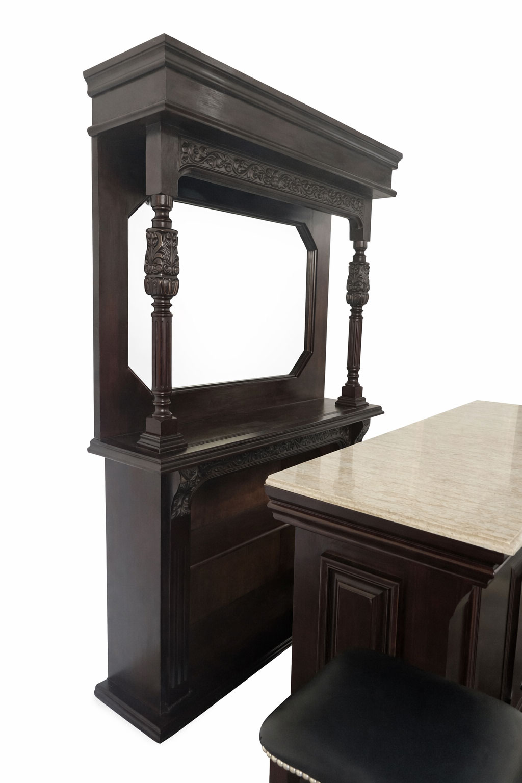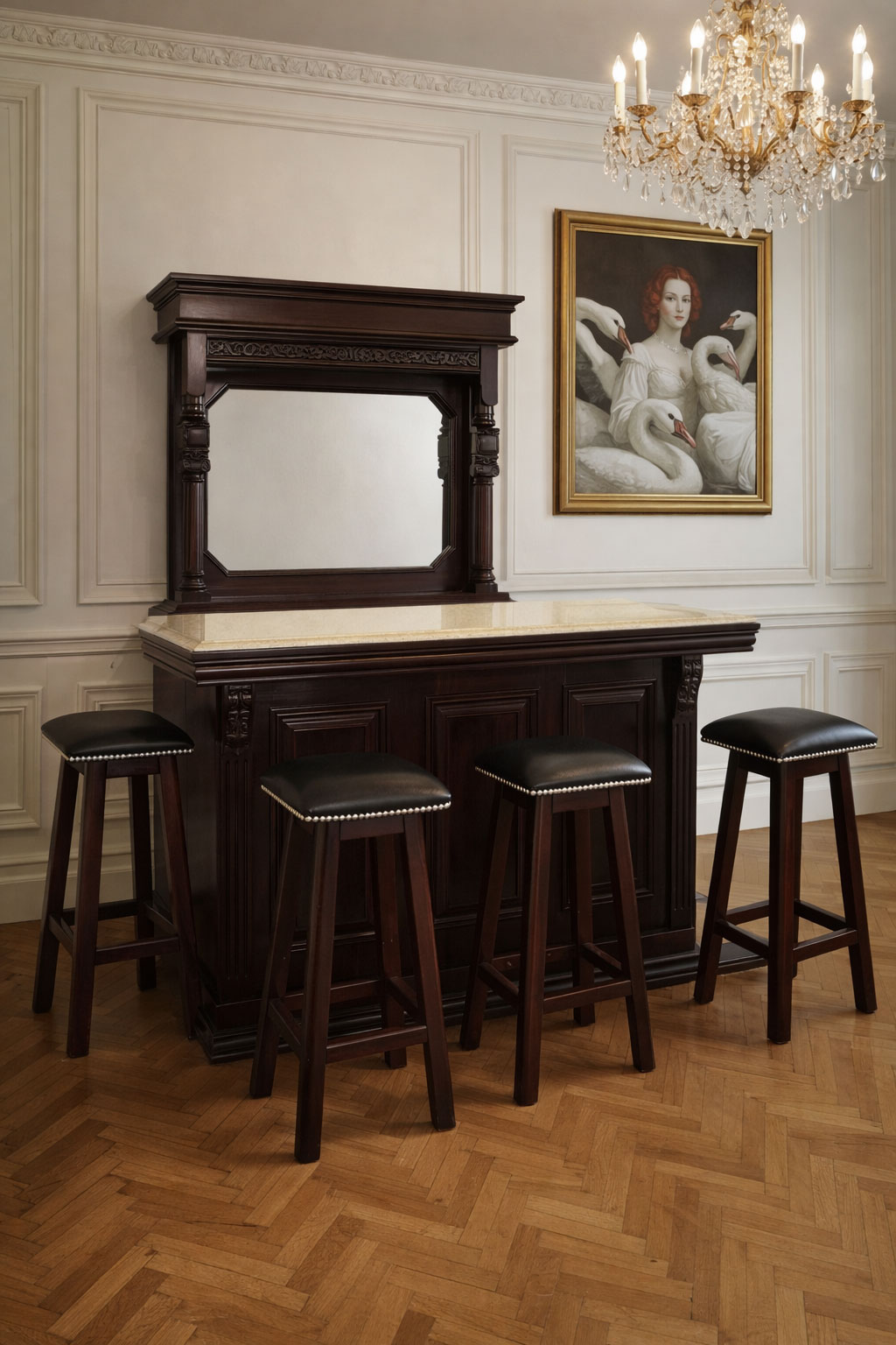 Diese handgeschnitzte Kellerbar im Antik Stil mit echter Marmorplatte, Spiegel und vier Hockern verwandelt jeden Raum in eine stilvolle Hausbar mit historischem Flair und beeindruckender Präsenz.