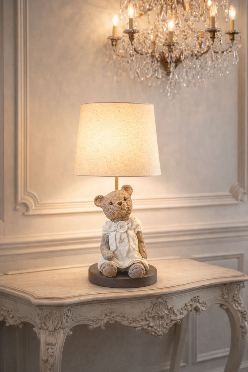 Im Mittelpunkt steht die niedliche Bärchen-Figur, die als kunstvoll gestaltete Lampenbasis dient. Gefertigt aus Polystein und in aufwendiger Handarbeit bemalt, überzeugt sie durch ihre detailreiche Ausarbeitung und ihren sanften, märchenhaften Ausdruck. Die antik anmutende Oberfläche unterstreicht den nostalgischen Charakter und verleiht der Leuchte eine besonders charmante Ausstrahlung.