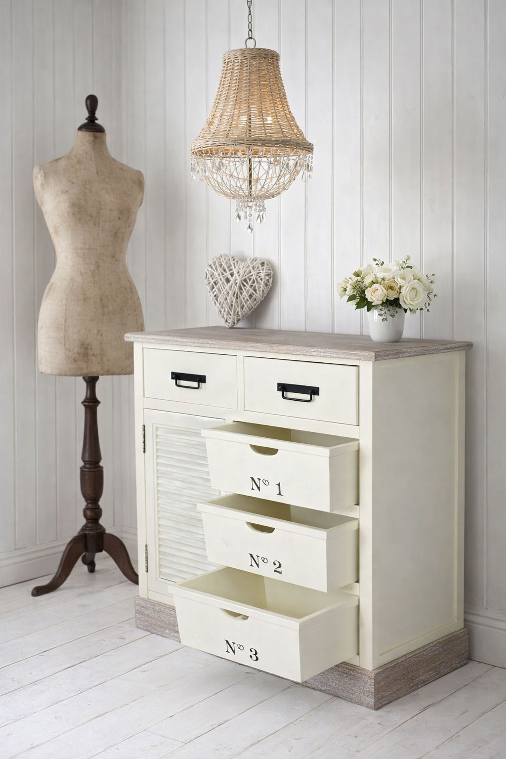 Mit seiner altweiß gestrichenen Oberfläche, den bewusst eingearbeiteten Gebrauchsspuren und den charmanten französischen Beschriftungen wird dieses Möbelstück zum stilvollen Blickfang in jedem Raum.