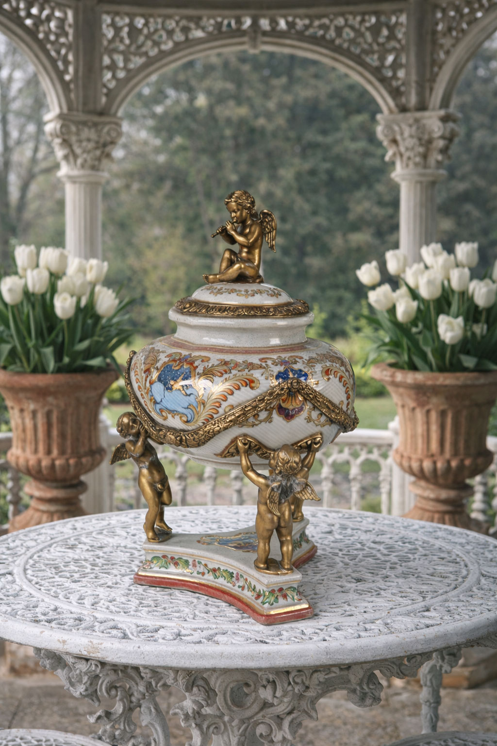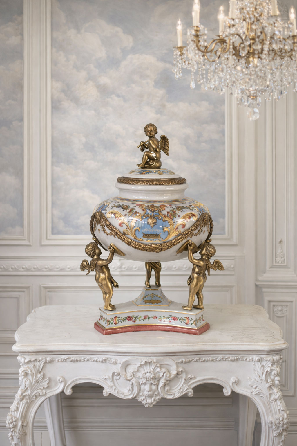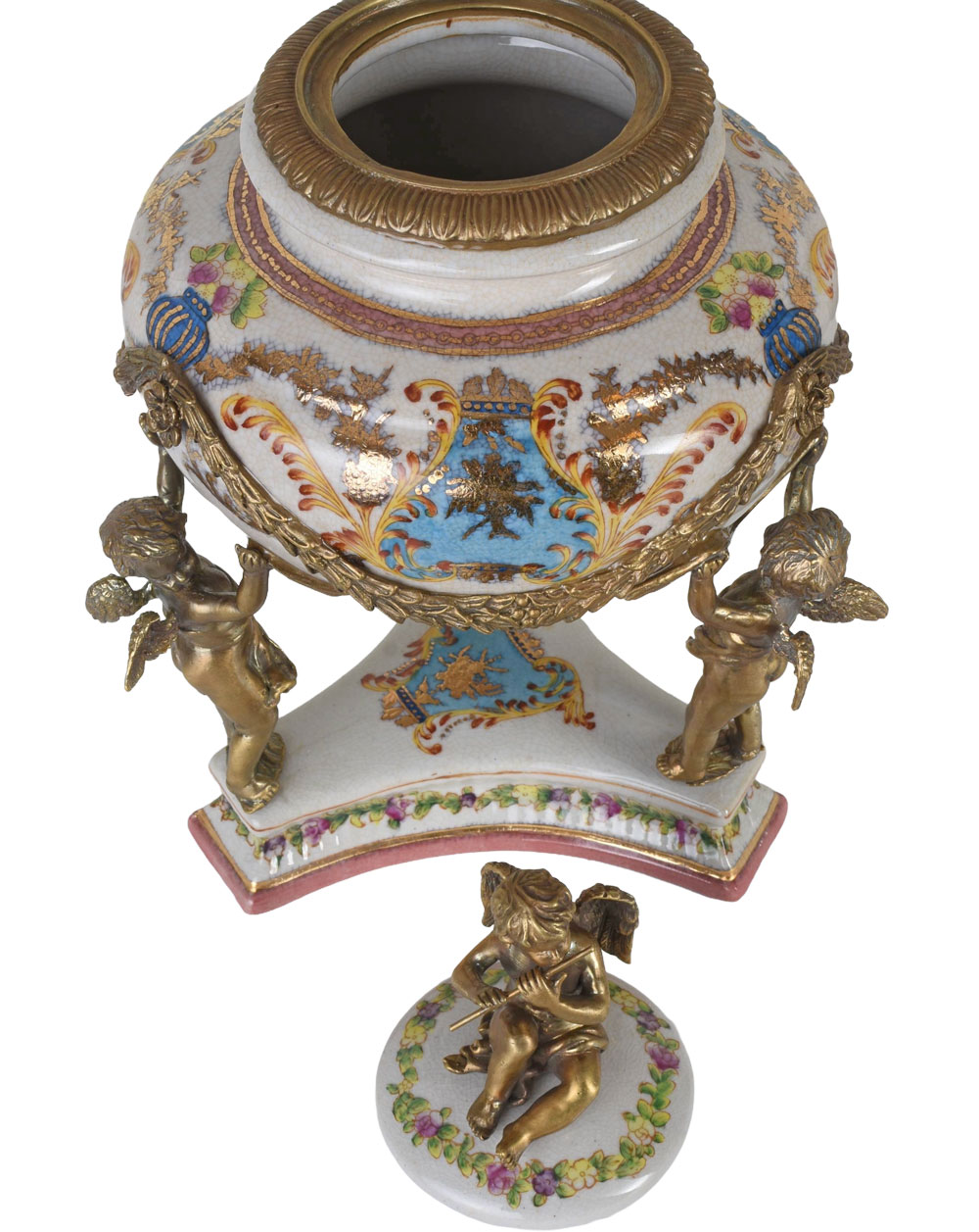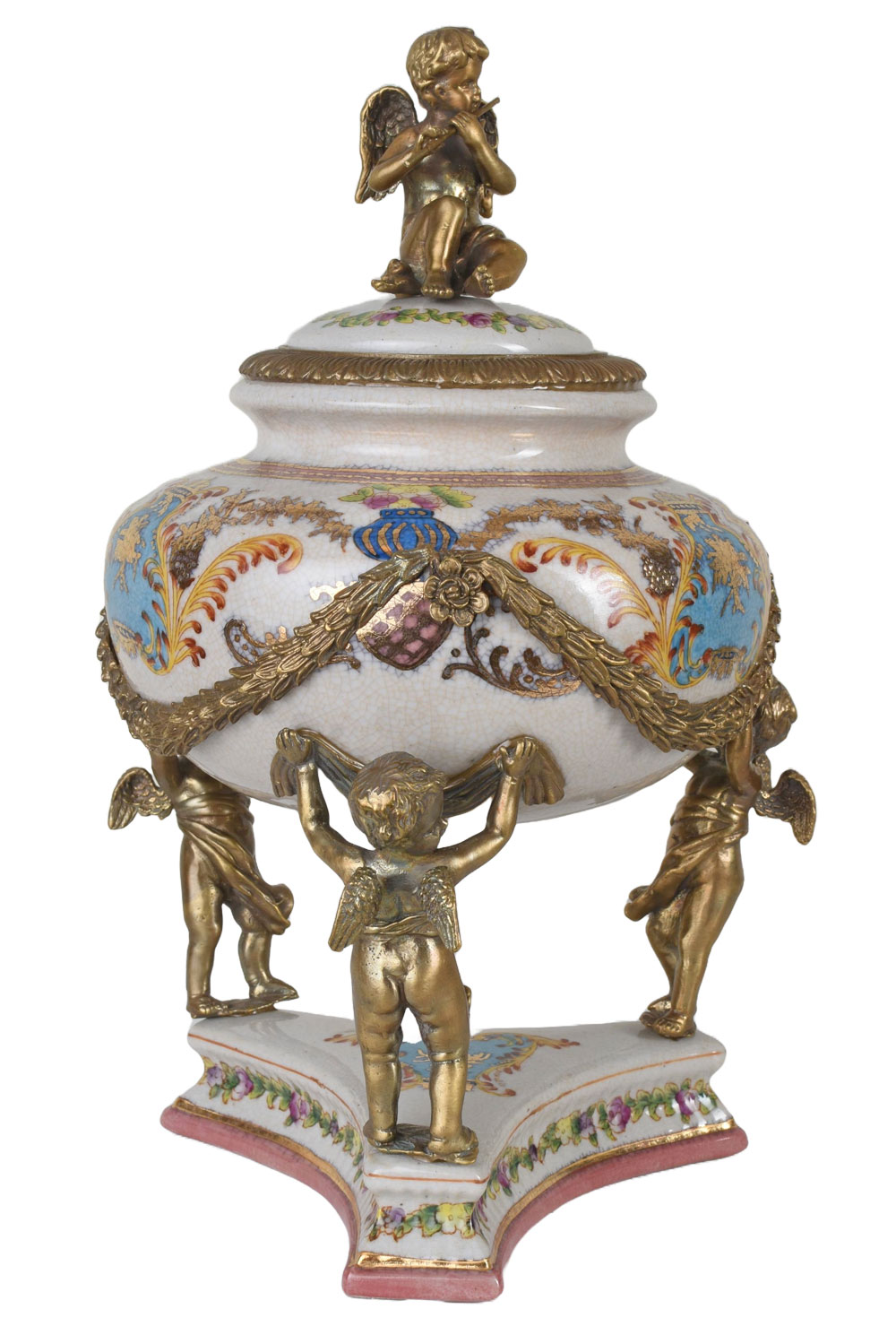 Opulentes Barock-Deckelgefäß aus handbemaltem Krakelee-Porzellan mit schweren Bronzemontierungen und Engel-Figuren – ca. 35 cm hoch, exklusives Sammlerstück.