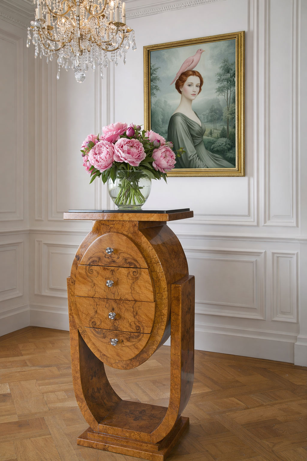 Art Deco Kommode „Bauhaus Villa“: Französische Lyra-Kommode mit Wurzelholzfurnier, hochglanzpoliert, vier Schubladen. Maße: 114 x 50 x 37 cm – glamourös und funktional.