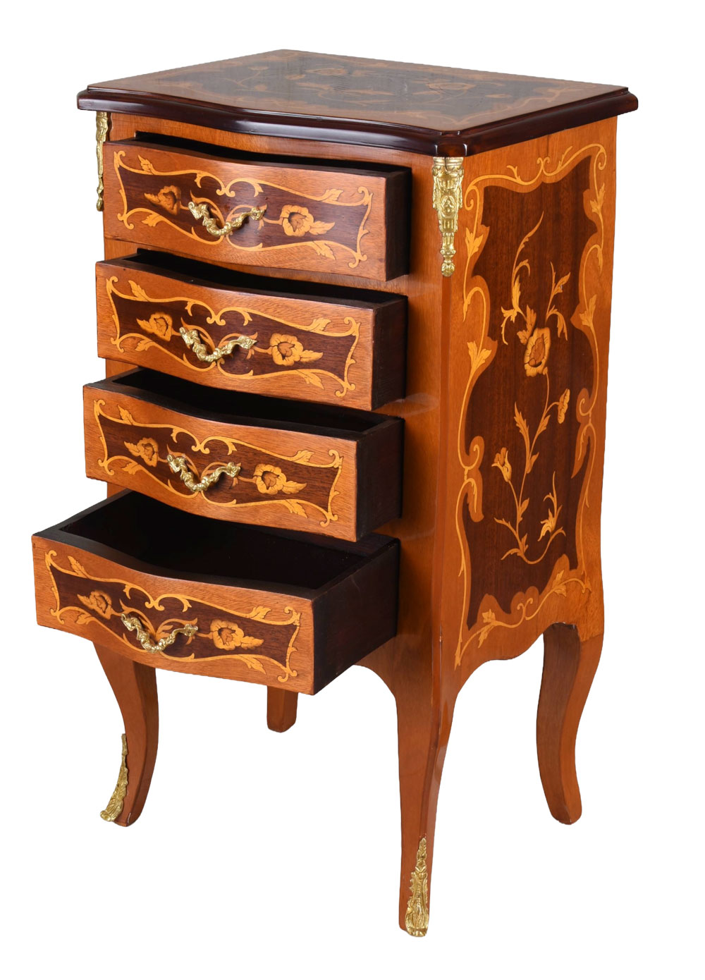 Zeitlose Eleganz im Schlafzimmer: Die Antik-Kommode „MADAME HENRIETTE“ – handgefertigte Barock-Kommode aus massivem Holz mit kunstvollen Intarsien, vier geräumigen Schubladen und kompakten Maßen von ca. 79 × 36 × 29 cm. Viel Stauraum bei aristokratischem Flair. Ohne Dekoration. Höhe ca. 79 cm / Breite ca. 36 cm / Tiefe ca. 29 cm Schubladen ca. 22 cm x 24 cm x 6 cm Ohne Dekoration