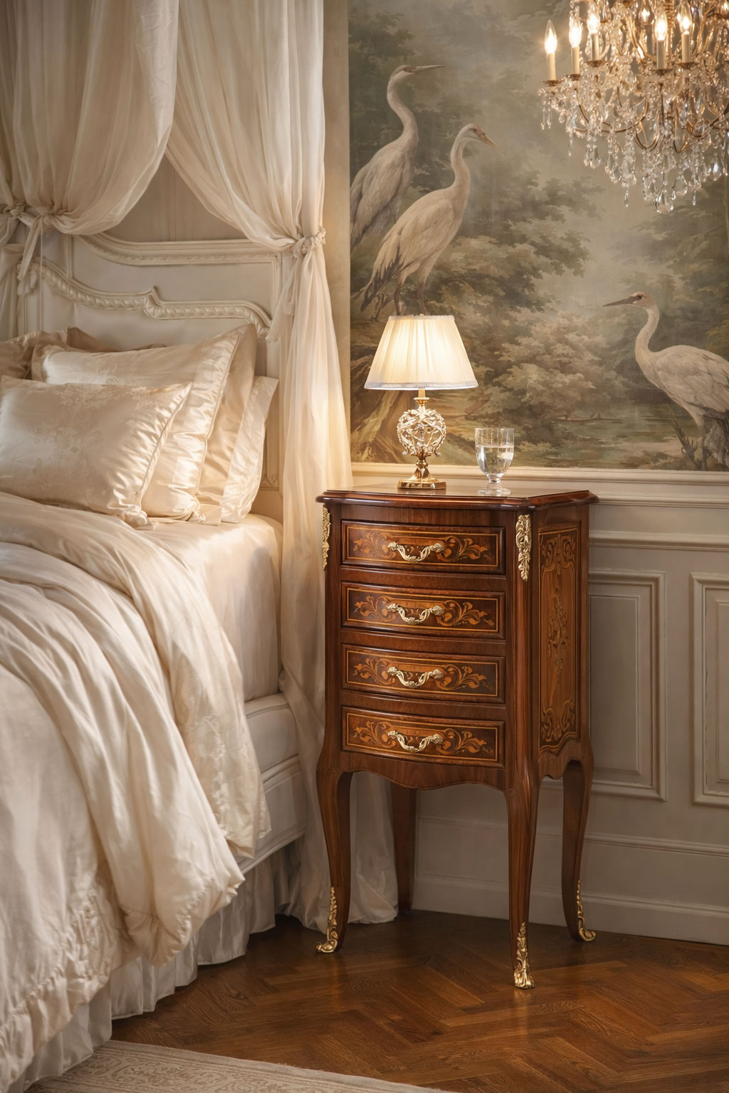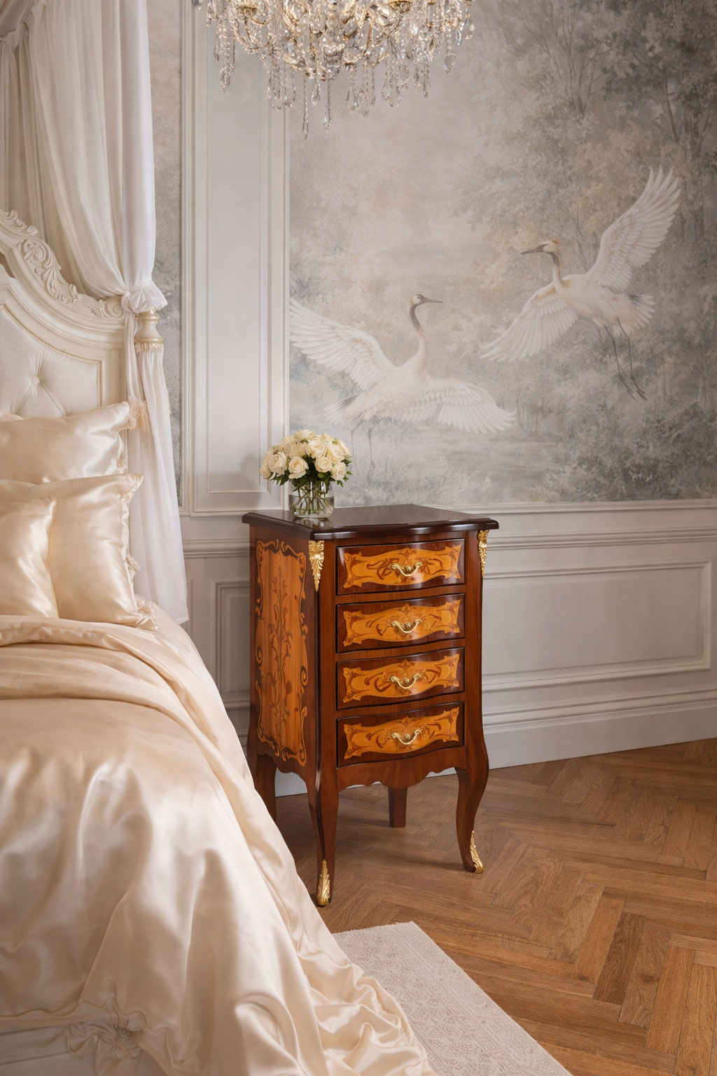 Die Nachtkommode „Madame Henriette“ ist eine stilvolle Hommage an den französischen Barock und vereint zeitlose Eleganz mit funktionaler Raffinesse.
