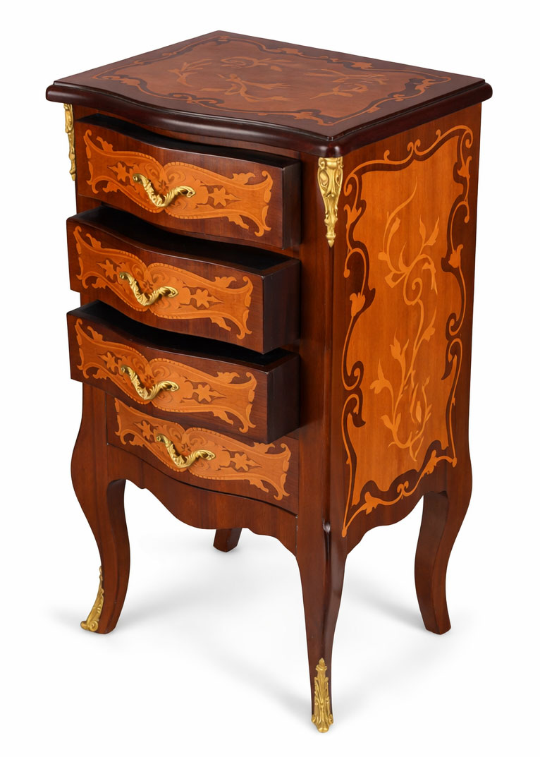 Achtung: Jede Kommode wird einzeln von Hand gefertigt, daher unterscheiden sich die Intarsienmuster.