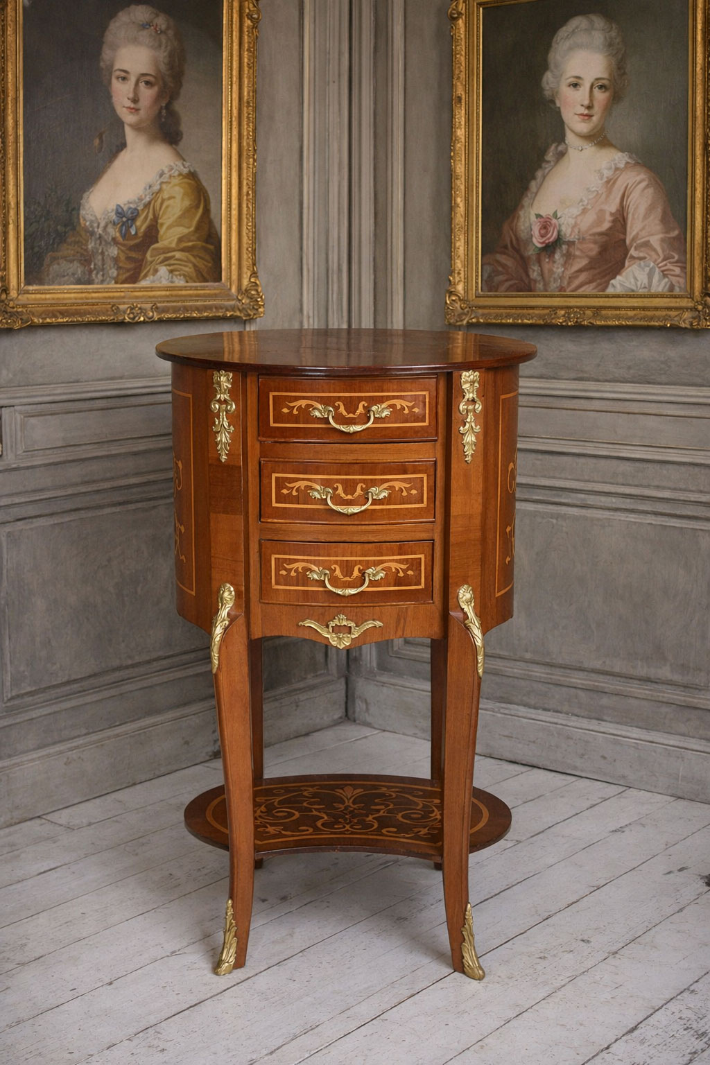 Ovale Barock-Kommode „Madame Isolde“ mit feinen Intarsien. Drei Schubladen, nierenförmige Ablage, aufwendig handgearbeitet. Vielseitig einsetzbar als Nachtkommode, Beistelltisch oder Konsole. Maße: H 78 × B 48 × T 37 cm.