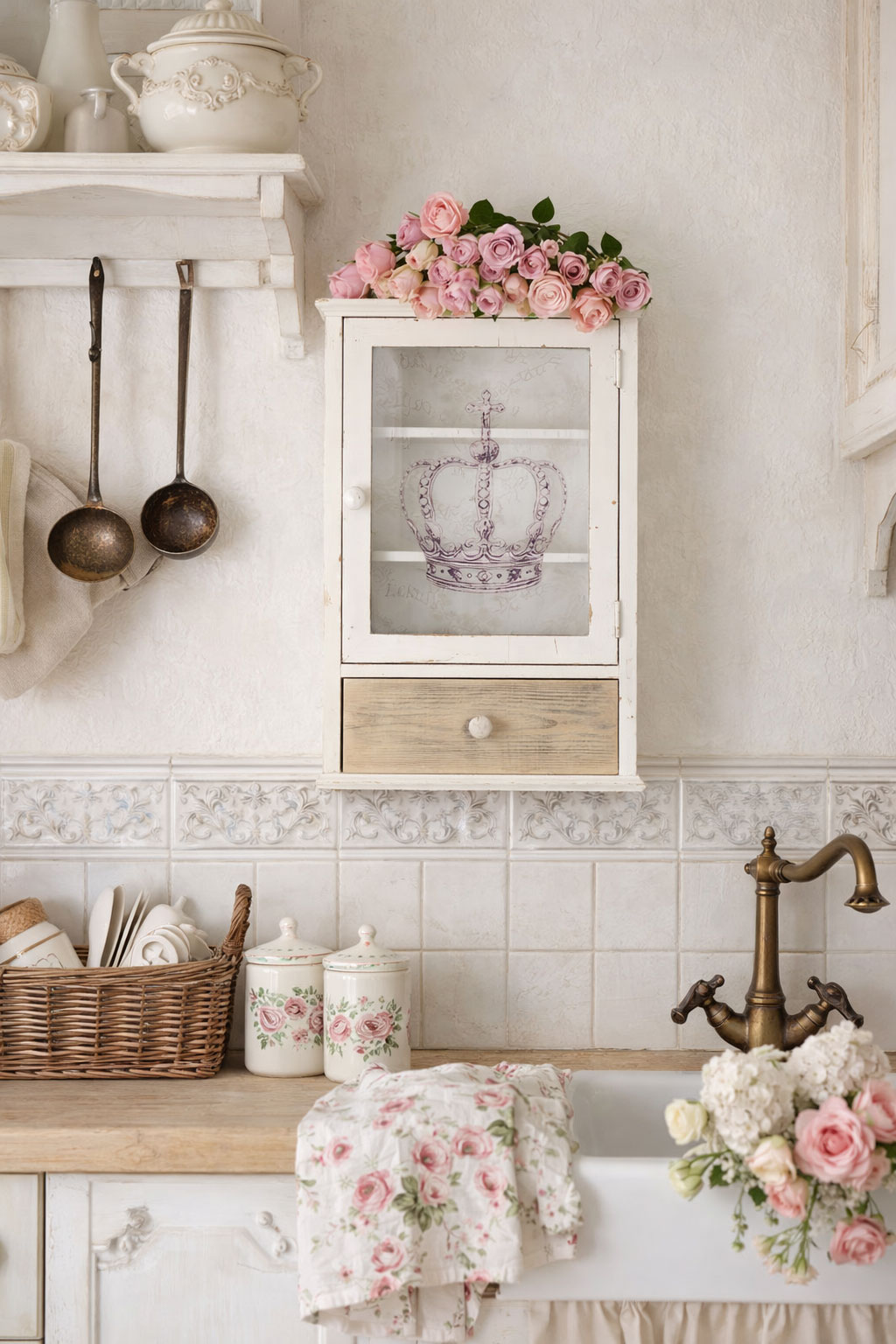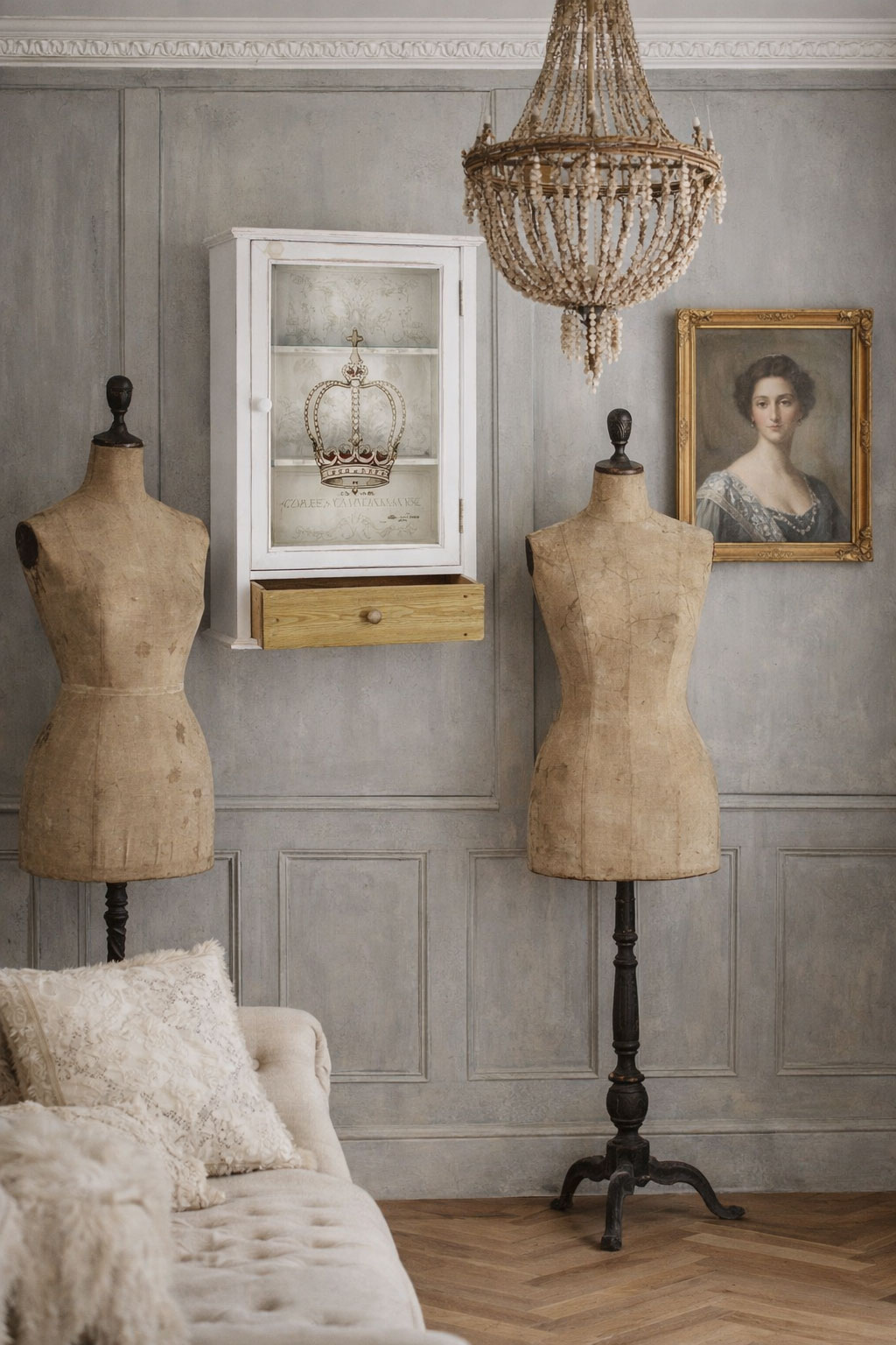 Der WANDSCHRANK „VILLA NOSTALGIA“ verbindet Shabby Chic mit Vitrinen-Charme und einem edlen Kronen-Motiv im Glas. Mit Ablageböden und Schublade bietet er stilvollen Stauraum auf kompaktem Raum. Maße: H 60 × B 40 × T 20 cm. Ohne Dekoration