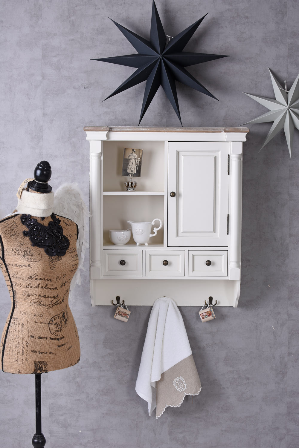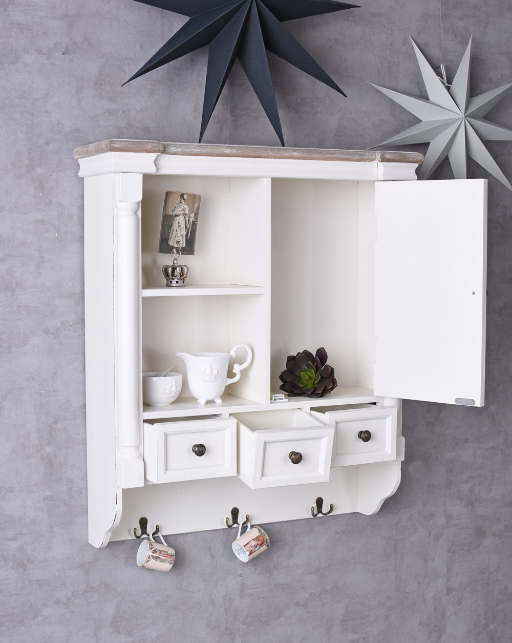 Der Wandschrank „Chateau de Ville“ bringt französisches Landhausflair in Küche, Flur oder Bad. Hergestellt aus Holz in Altweiß mit zarter Ornamentik und Shabby-Chic-Patina, kombiniert er Stil und Funktion auf charmante Weise. Mit Tür, drei Schubladen und Haken bietet er Platz für Küchenaccessoires, Schlüssel oder Deko. Maße: Höhe 75 cm • Breite 65 cm • Tiefe 20 cm Ein dekoratives Stilmöbel im nostalgischen Vintage-Look.