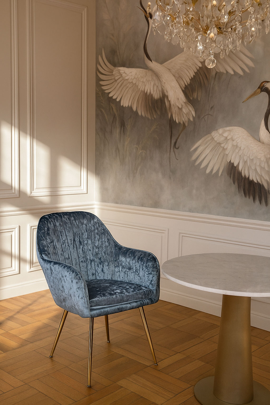 Mit seiner eleganten Linienführung, dem schimmernden Samtbezug und den goldfarbenen Metallbeinen vereint dieses Modell extravaganten Stil mit erstklassigem Sitzkomfort – ideal für stilvolle Ess- und Wohnbereiche.