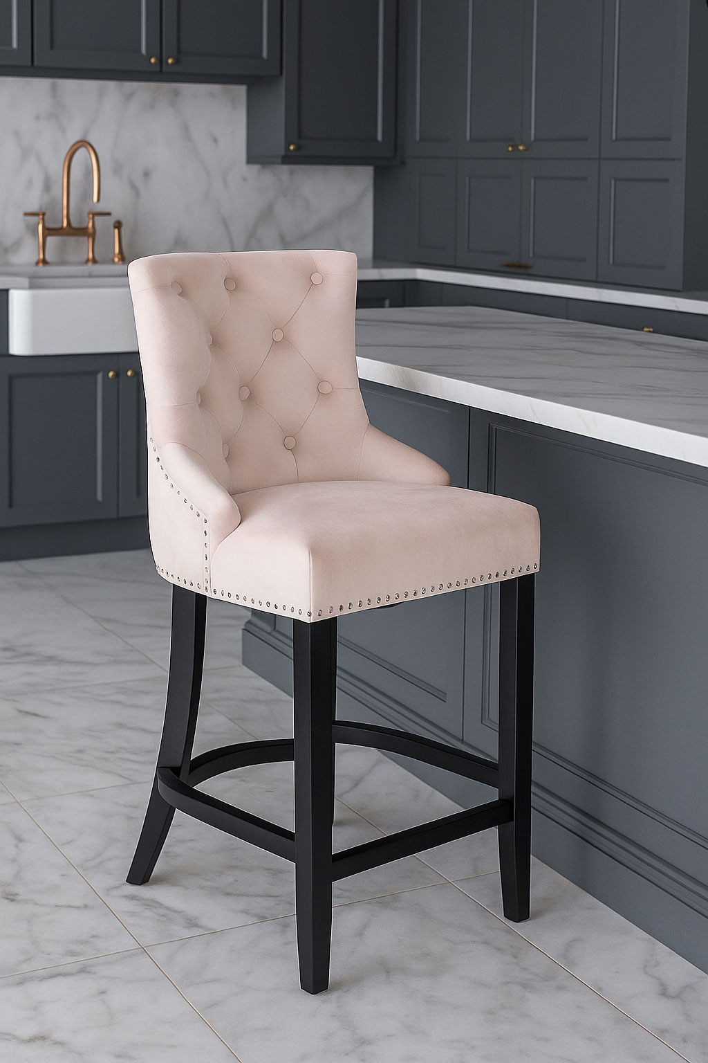 Luxus Barhocker „Country Club“ mit Chesterfield-Steppung, Metallgriff & Nieten. Samtbezug, massives Holzgestell mit Fußstütze. Maße: H 113 cm, SH 74 cm. Stilvoll für Küche, Bar, Esszimmer. Lieferung ohne Deko, Montage einfach.