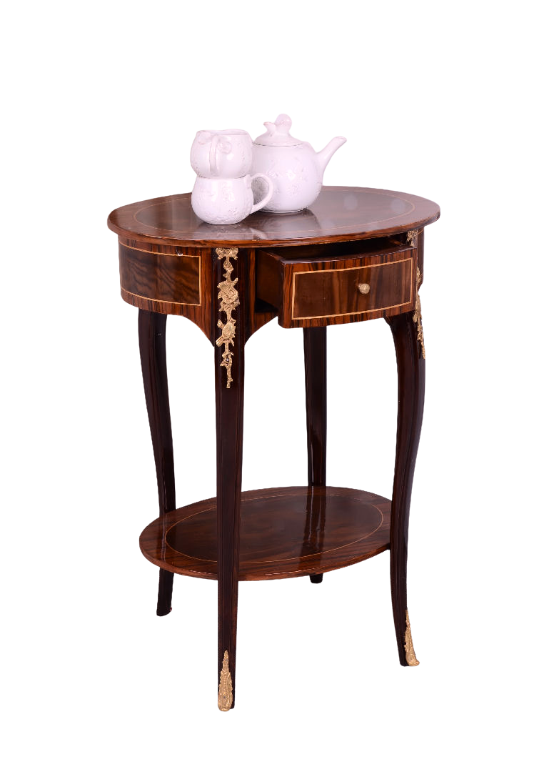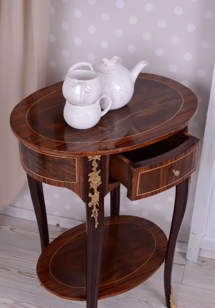 Gefertigt aus edlen Hölzern und mit detailreichen Holzintarsien aus verschiedenen Edelholzarten versehen, besticht der Tisch durch seine warme Farbgebung und harmonischen Proportionen. Eine praktische Schublade bietet Platz für kleine Utensilien oder Accessoires.