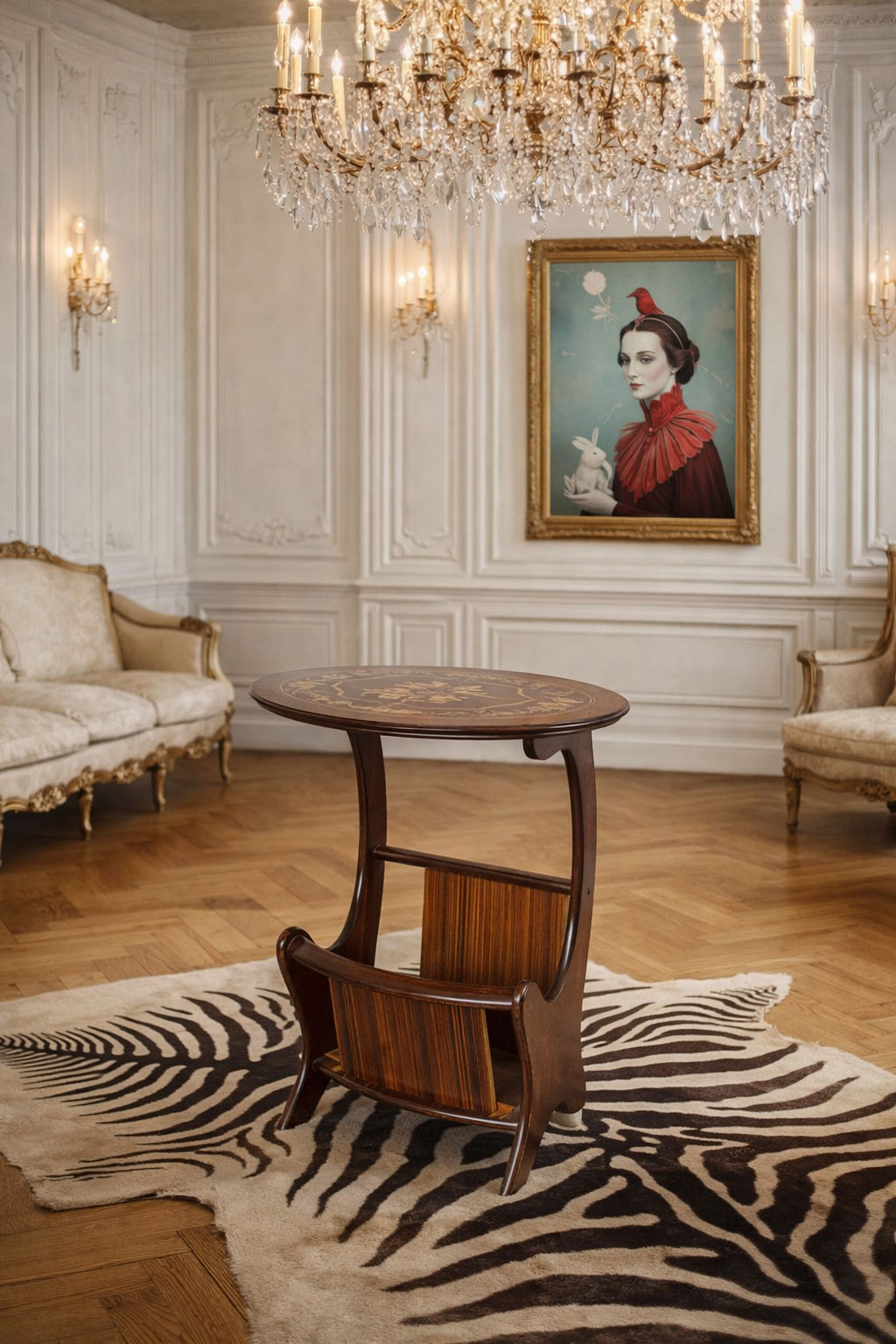 Mit seinen kompakten Maßen – Höhe ca. 62 cm, Breite ca. 52 cm, Tiefe ca. 37 cm – eignet sich der Tisch ideal als Zeitungsständer im Wohnzimmer, als Beistelltisch im Schlafzimmer oder als dekoratives Möbelstück in repräsentativen Bereichen. Leichte Gebrauchsspuren und Restaurierungen unterstreichen den authentischen, antiken Charakter. Da die Muster der Intarsien leicht vom Foto abweichen können, besitzt jedes Exemplar eine einzigartige Ausstrahlung.