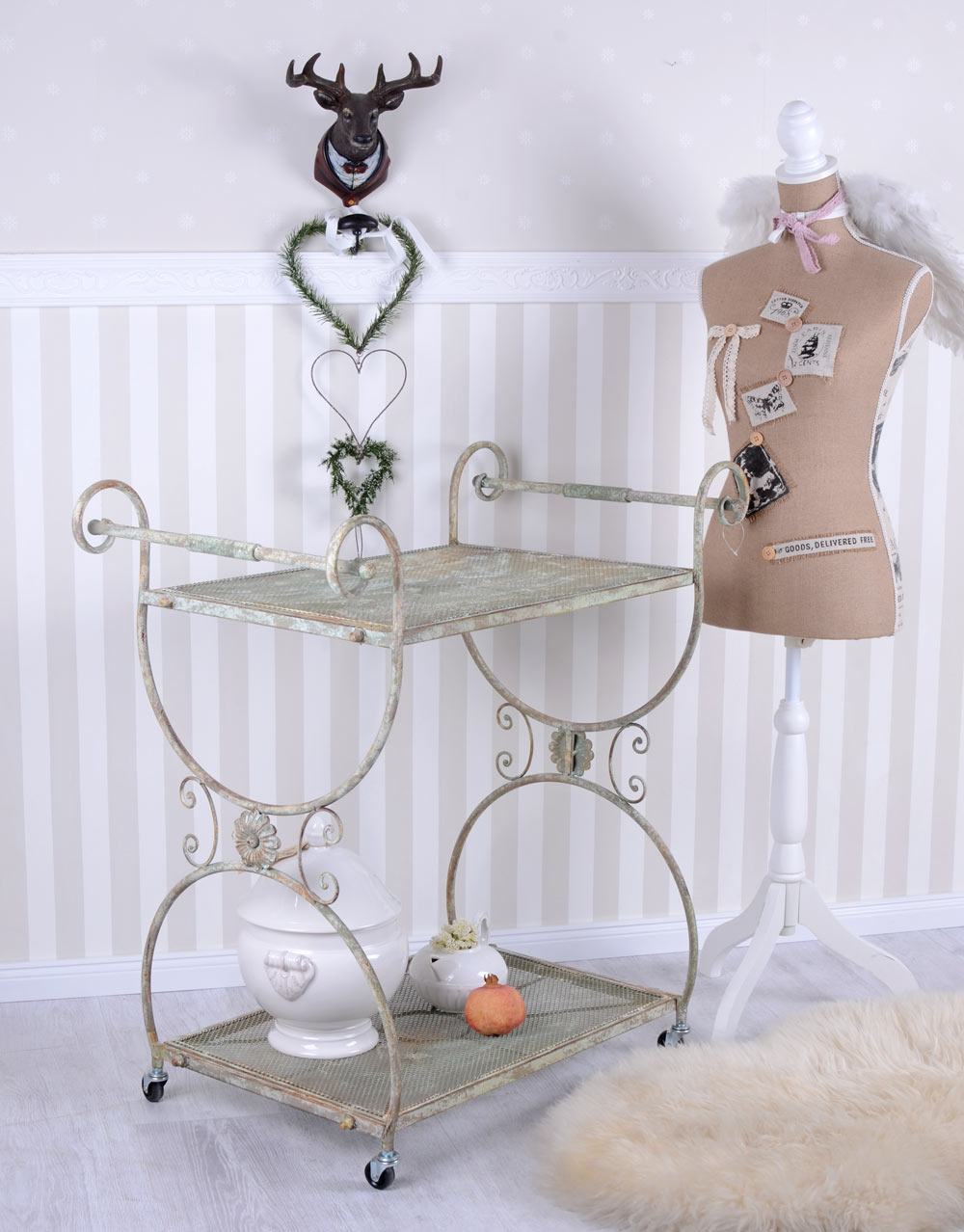Gefertigt aus lackiertem Eisen in authentischer Shabby-Chic-Optik, zeigt dieses Möbelstück charmante Gebrauchsspuren, die dem Design eine warme, gelebte Ausstrahlung verleihen. Die zwei großzügigen Ablagen bieten ausreichend Platz für Geschirr, Gläser, Teeservice oder Dekoration und machen den Wagen vielseitig einsetzbar – ob in Küche, Esszimmer, Wintergarten oder auf der Terrasse.