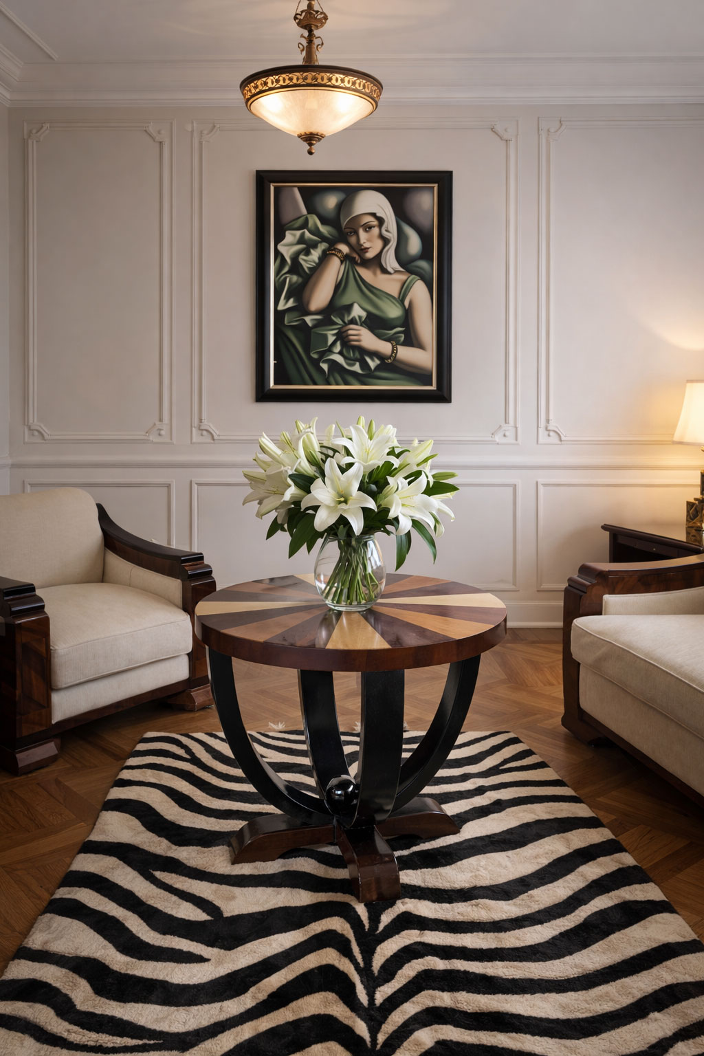 Der Couchtisch „Villa Gatsby“ ist ein elegantes Stilmöbel im französischen Art Deco-Stil und bringt den mondänen Glanz der 1920er Jahre direkt in Ihr Zuhause. Mit seiner runden Formgebung, den edlen Materialien und der glänzenden Oberfläche verkörpert er den luxuriösen Lebensstil des „Great Gatsby“-Zeitalters.