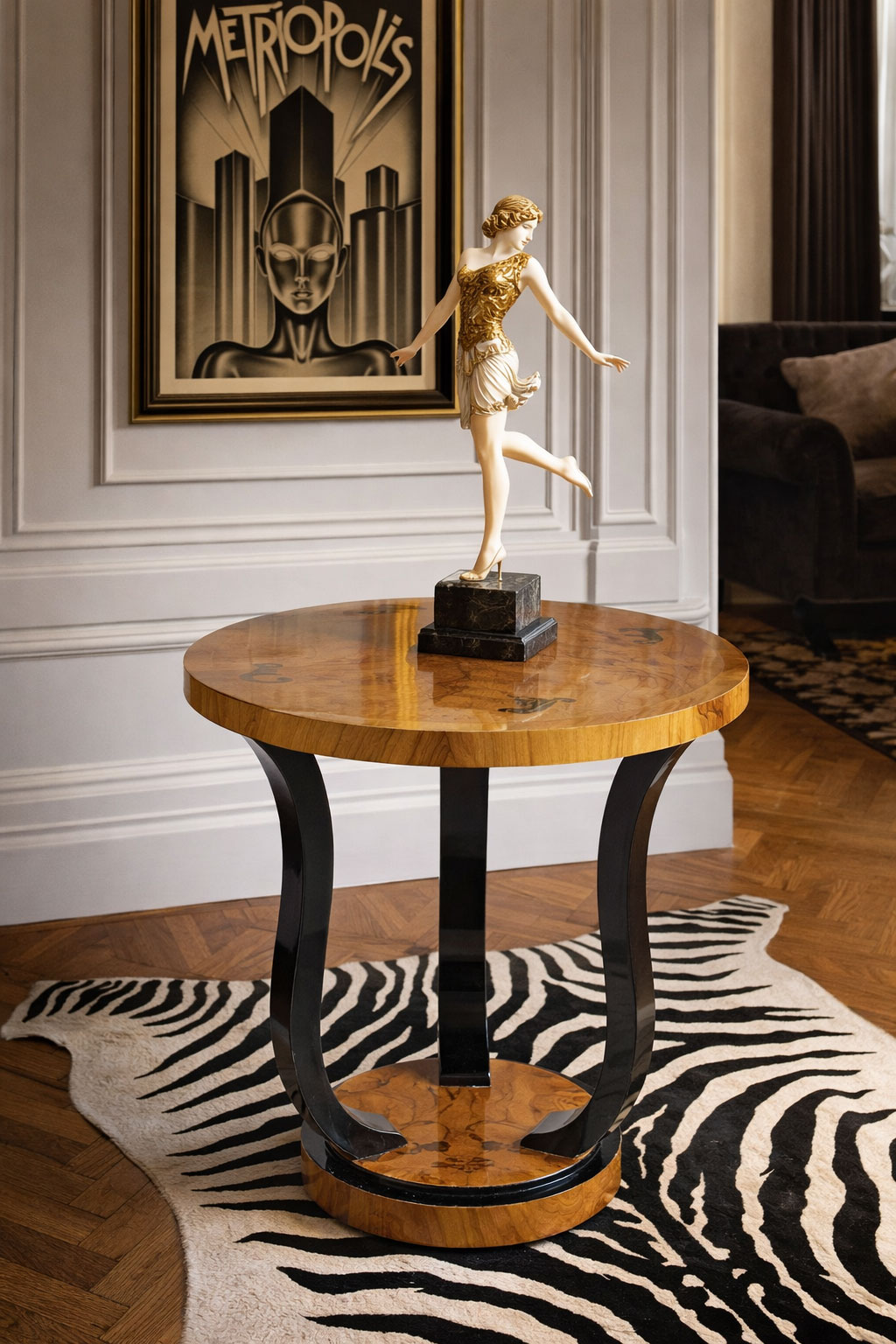 Art Deco Couchtisch „Villa Gatsby“: Eleganter Sofatisch aus Massivholz, hochglanzpoliert, mit Kugel und Voluten. Maße: ca. 66 x 60 cm – luxuriöses Design der 20er Jahre.