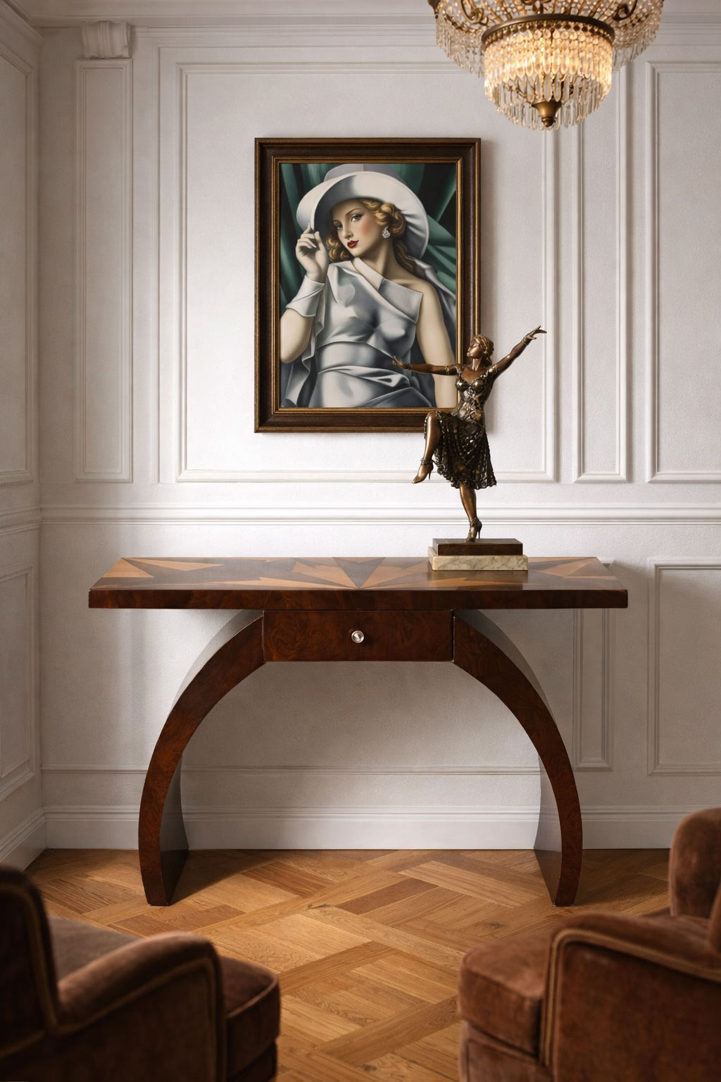 Elegante Art-Déco-Konsole mit Intarsien aus Edelhölzern – 120 cm breit, handgearbeitet & inspiriert von den Salons der 20er Jahre.