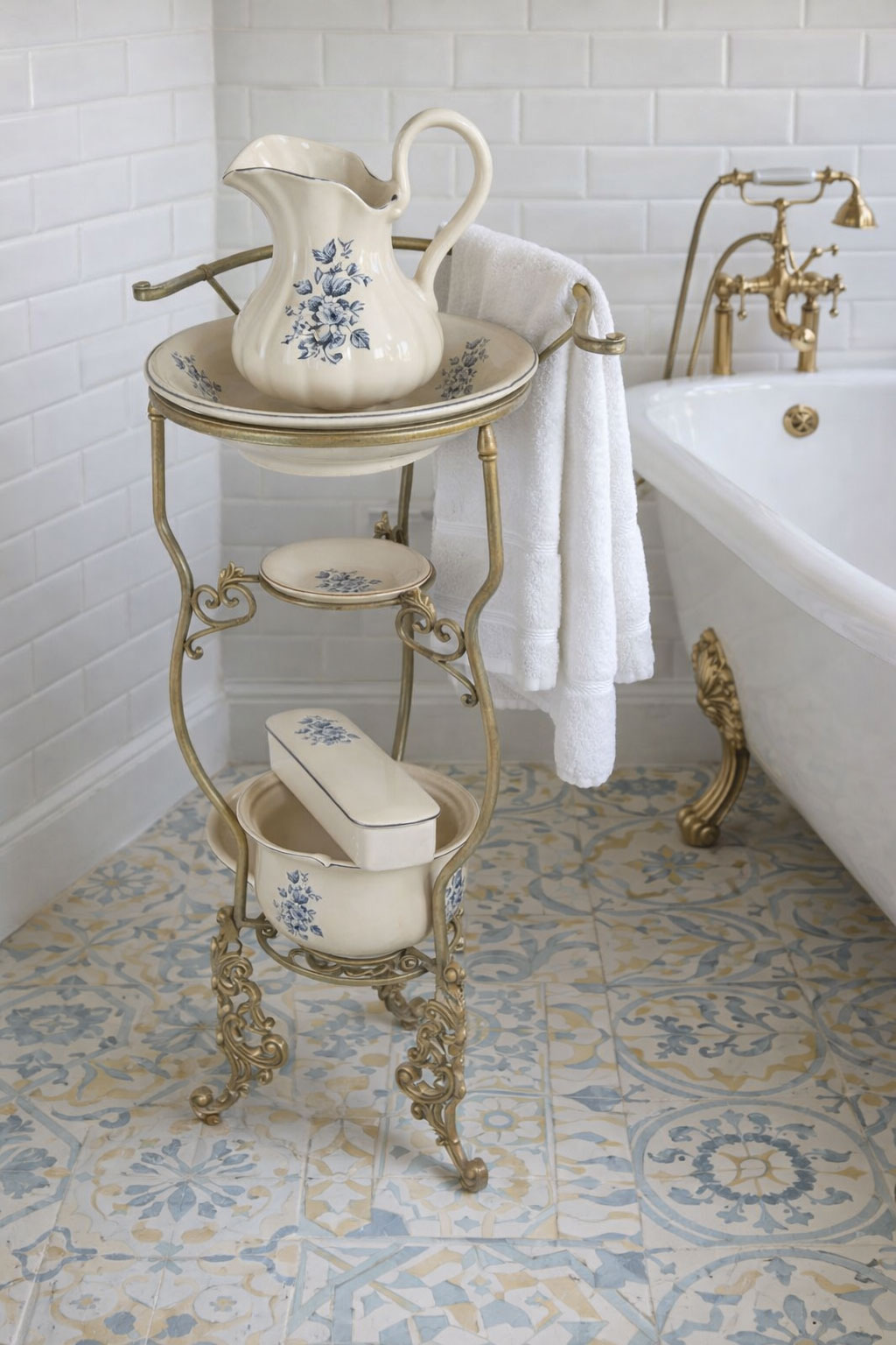 Der dekorative Waschtisch mit seinem antiken Charakter bildet den stilvollen Rahmen für dieses sechsteilige Ensemble, das Funktionalität und Ästhetik harmonisch verbindet.
