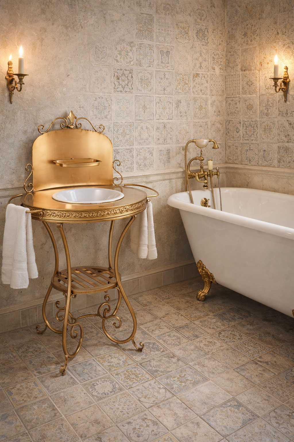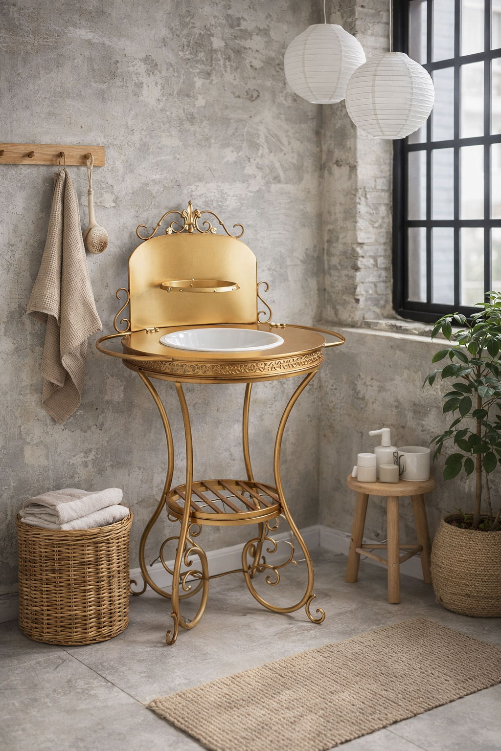 Nostalgischer Waschtisch im Brocante-Stil mit goldenem Eisengestell und Emaille-Schüssel. „Maison Brocante“ bringt romantisches Vintage-Flair in Bad, Garten oder Wintergarten.