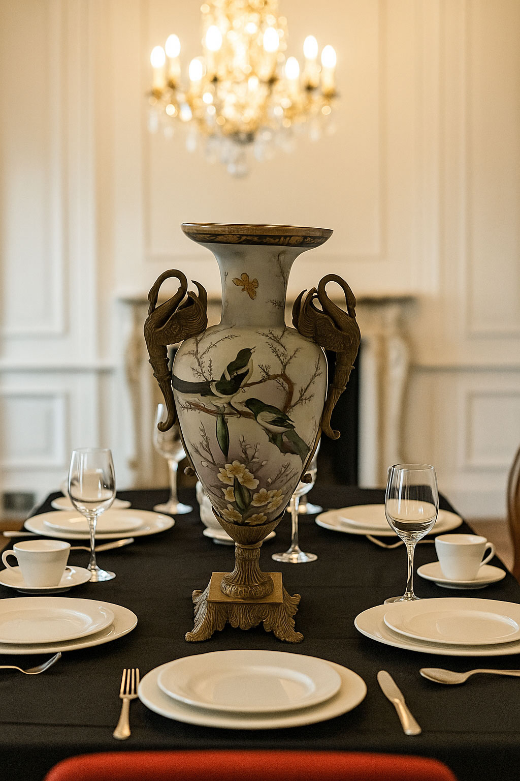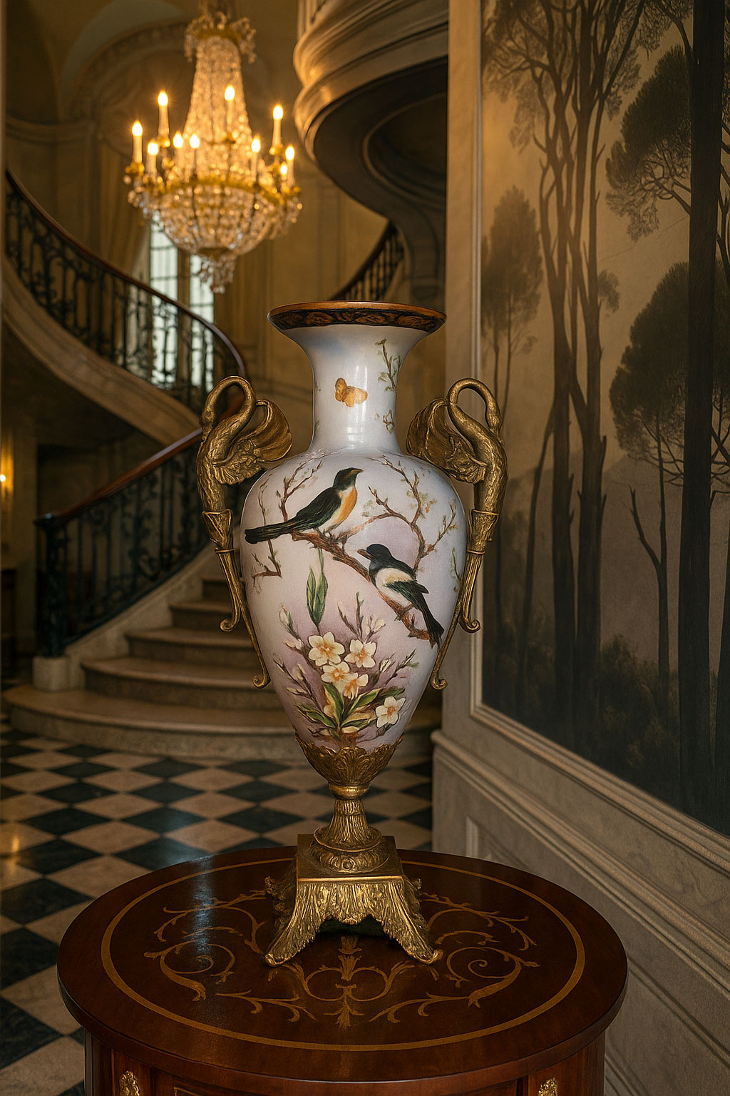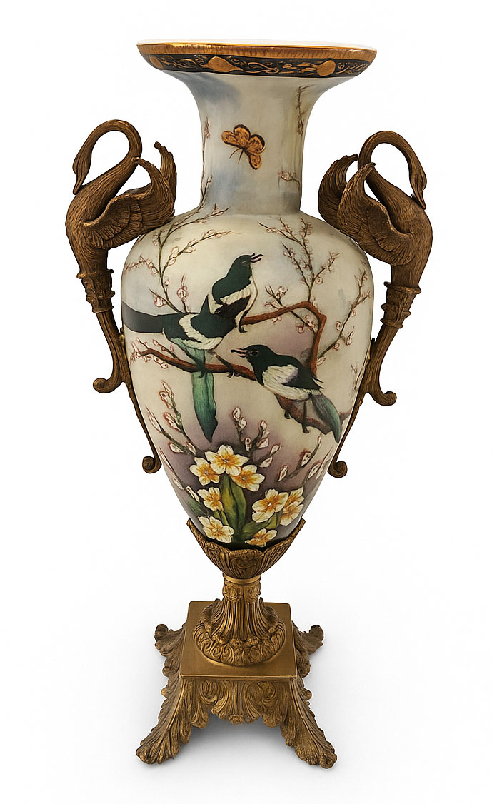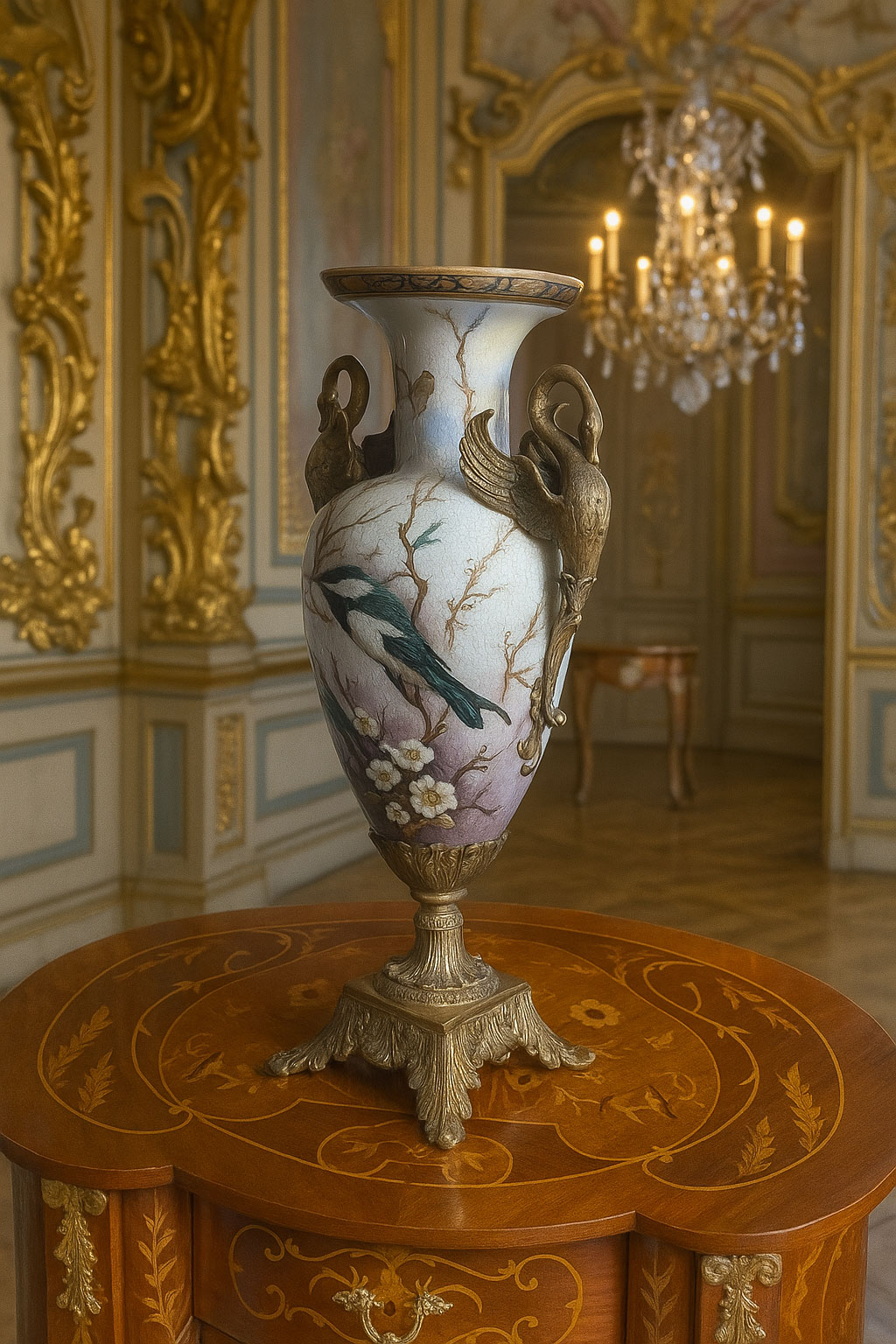 Prachtvolle Ormolu-Amphore „Schloss Sanssouci“ im Barockstil – mit Schwanenhenkeln, chinesischem Dekor und handveredelter Krakelee-Optik. Ein luxuriöses Prunkgefäß voller Eleganz und Charme.