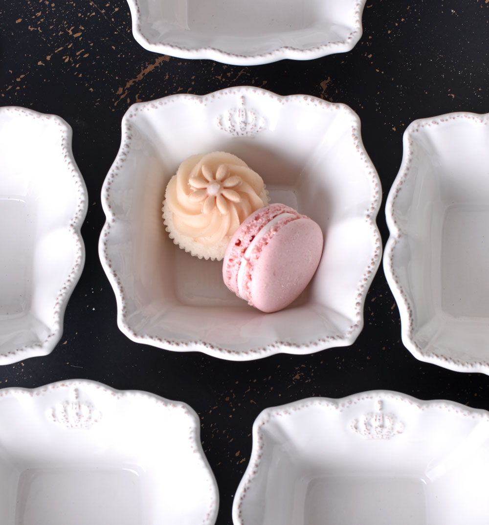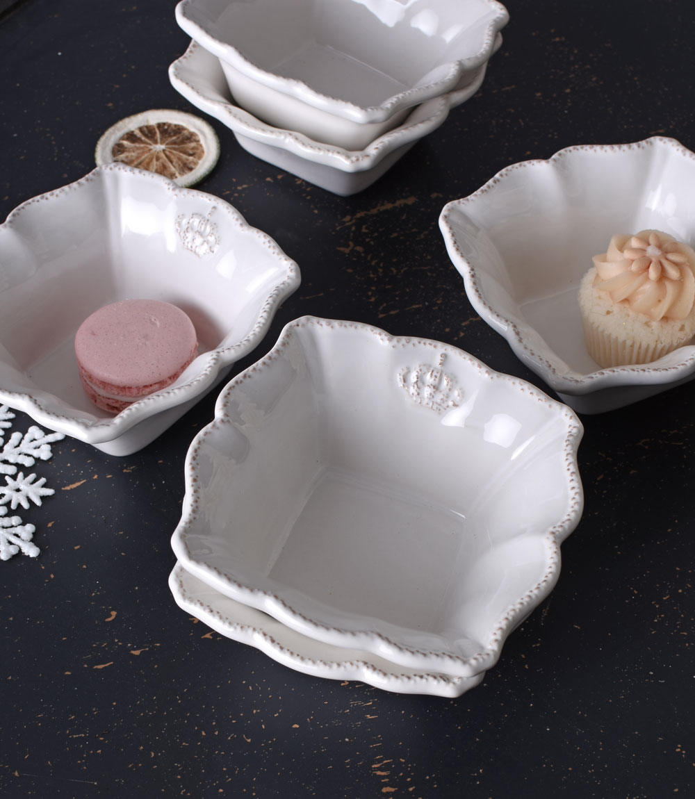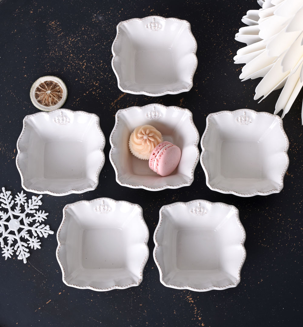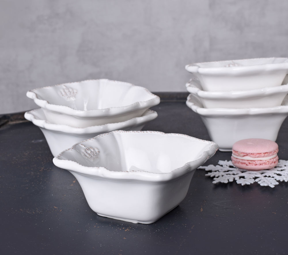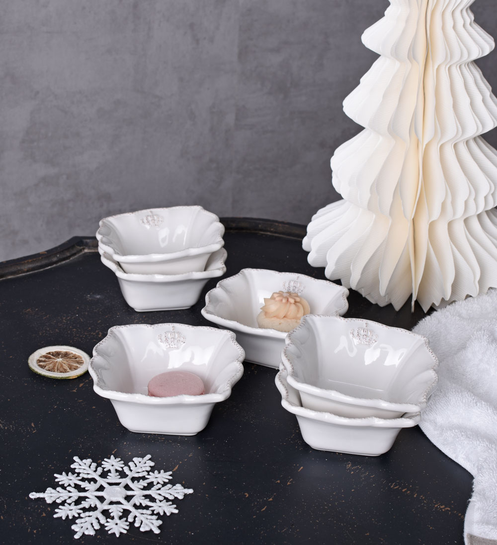 Das Schälchen-Set „Château Royal“ verleiht jeder Tafel einen Hauch französischer Noblesse. Die sechs Müslischalen im romantischen Landhausstil sind aus altweißem Porzellan gefertigt und zeichnen sich durch ihre verspielt-rustikale Ausarbeitung aus.