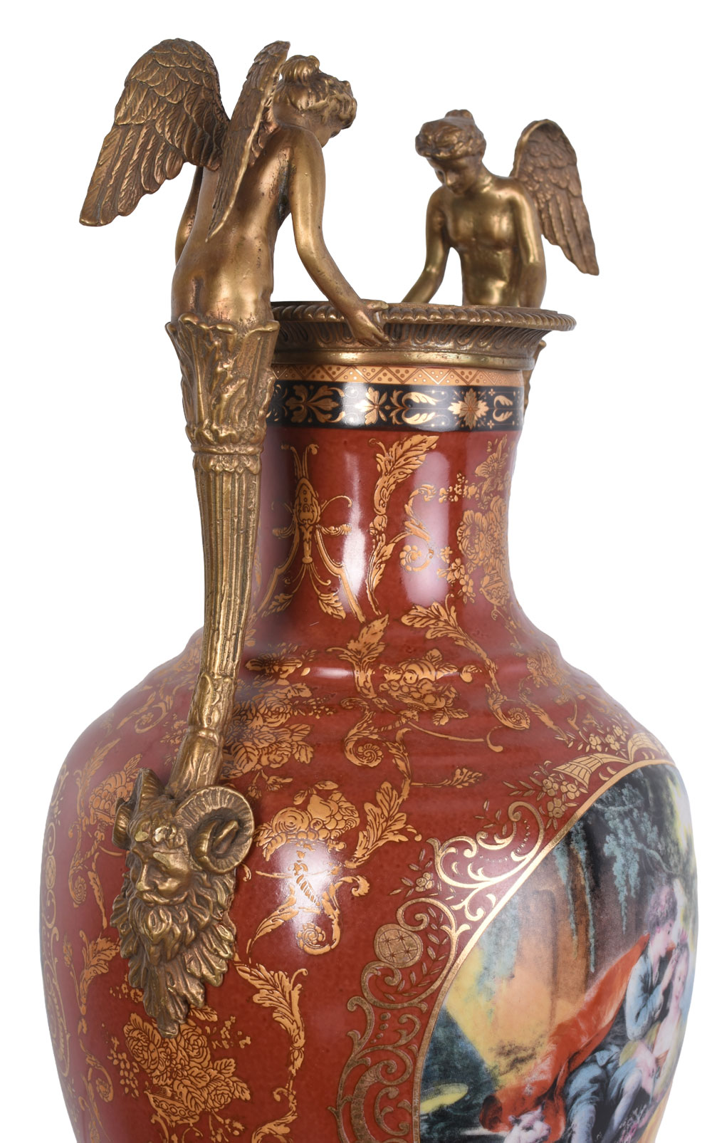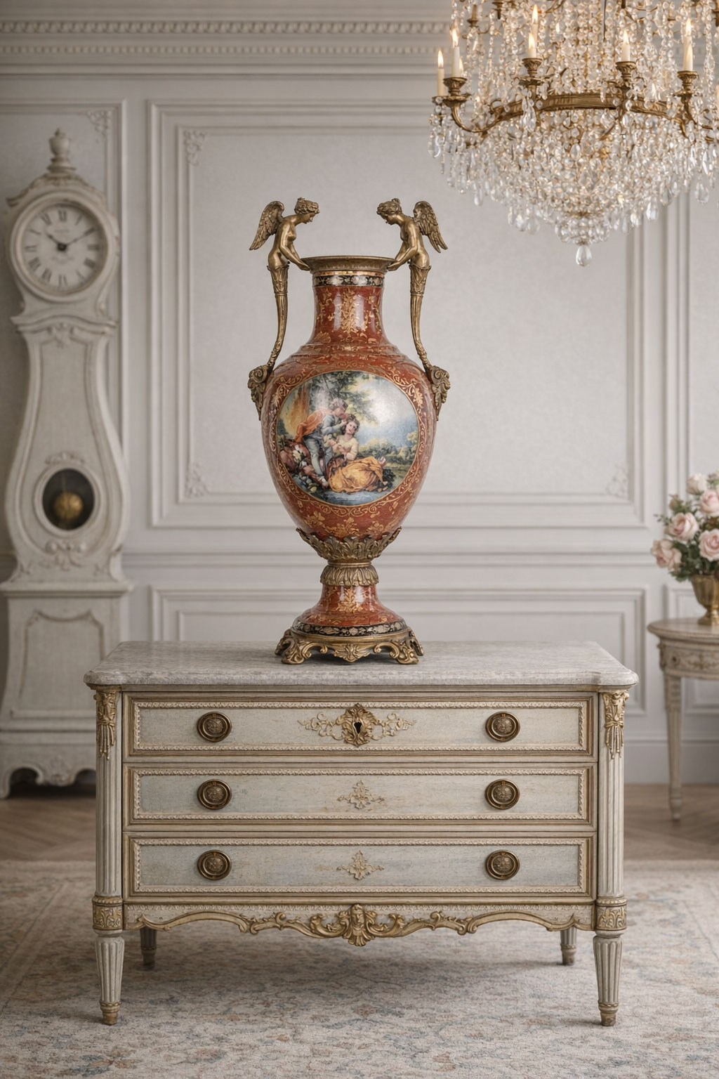Besonders eindrucksvoll sind die detailreich ausgearbeiteten allegorischen Engelsfiguren, die als Vasenhenkel fungieren, sowie die kunstvollen Maskaronenköpfe aus schwerer Bronze.