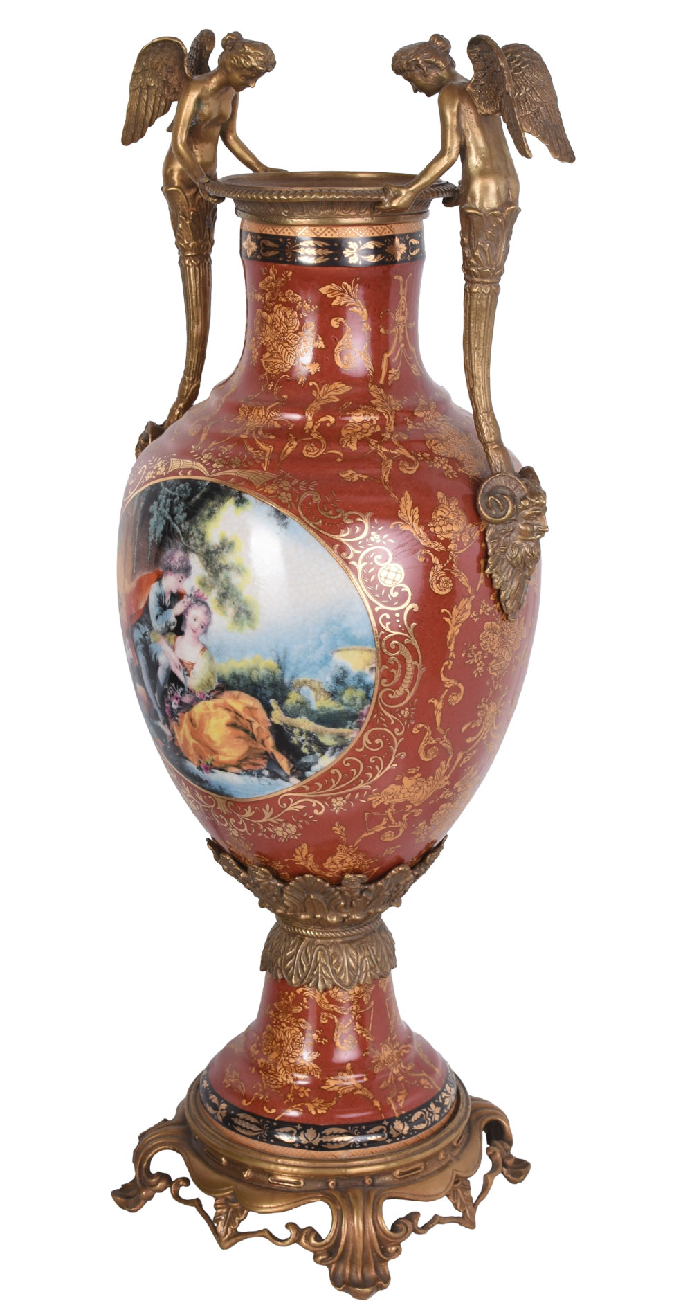 Die antikisierende Vase ist aus hochwertigem Porzellan gefertigt und reich mit schweren Bronzemontierungen veredelt.