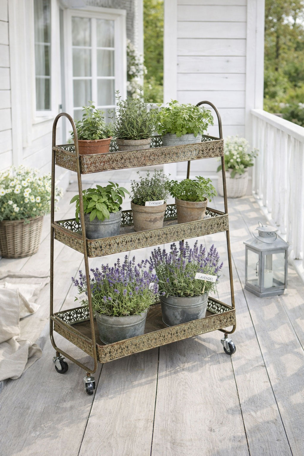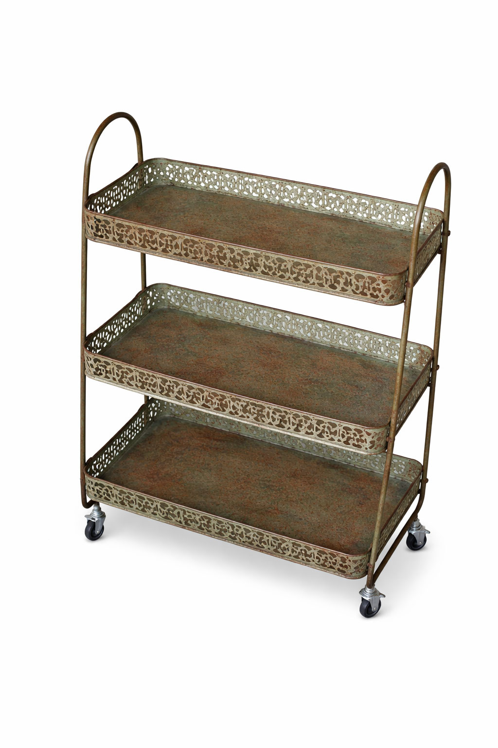 Gefertigt aus lackiertem Eisen im Vintage-Look, besticht der Wagen durch seine elegante Verarbeitung und seinen authentischen Shabby-Chic-Charakter. Die drei stabilen Tabletts bieten ausreichend Platz für Geschirr, Flaschen, Vorräte oder dekorative Wohnaccessoires.