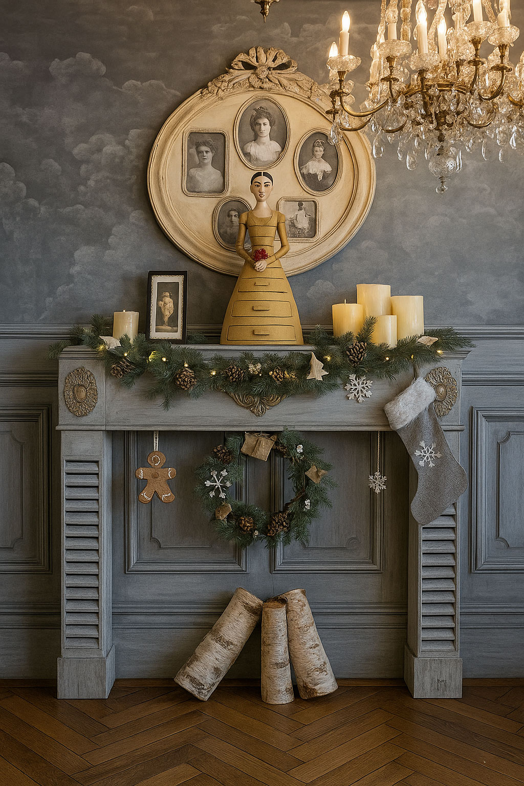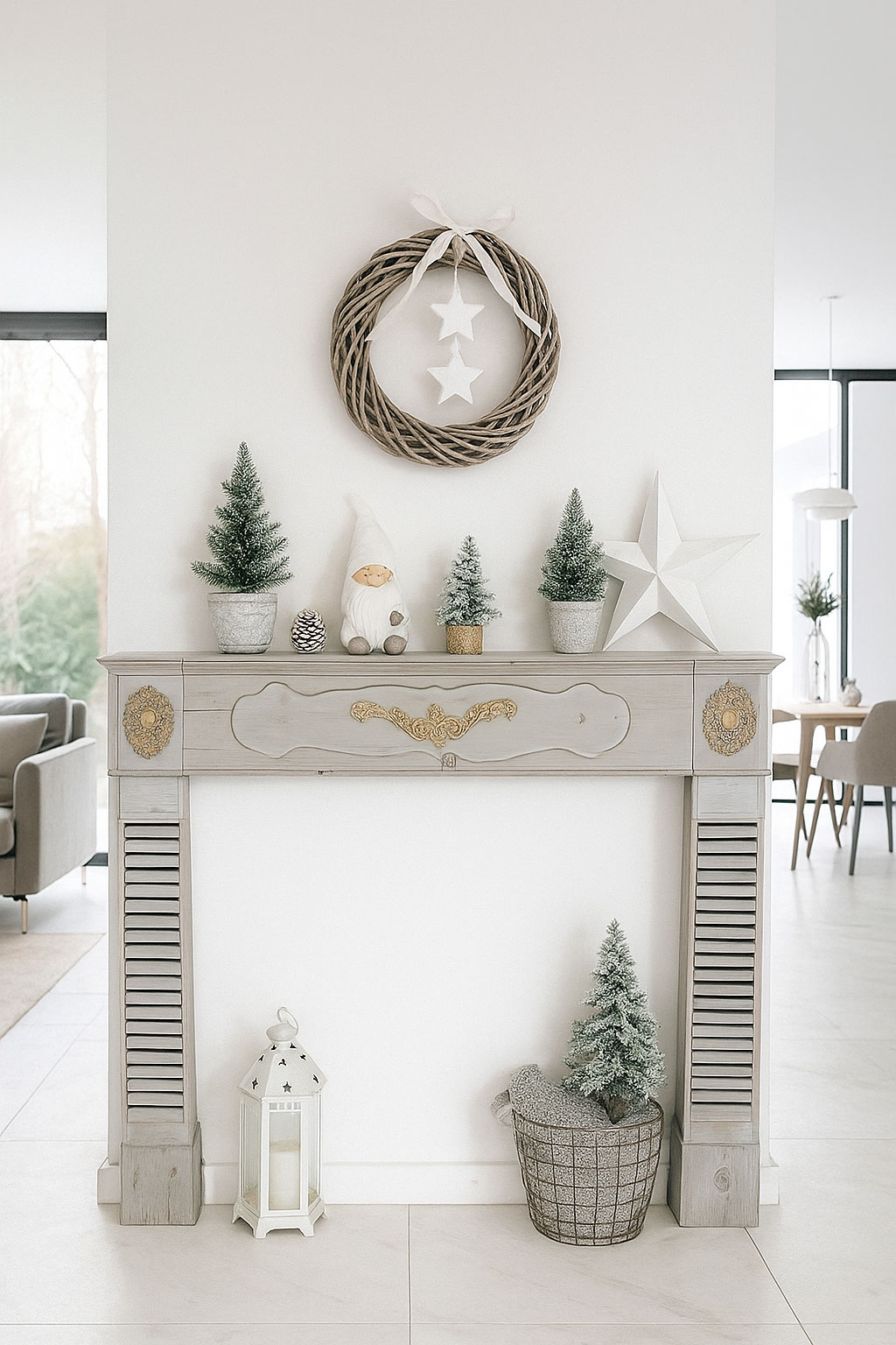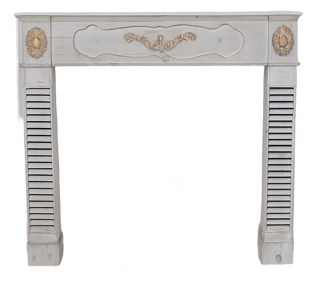 Romantische Kaminumrandung im Shabby-Chic-Stil – aus altem Holz, handgearbeitet, mit gewollten Gebrauchsspuren und nostalgischem Landhaus-Charme.