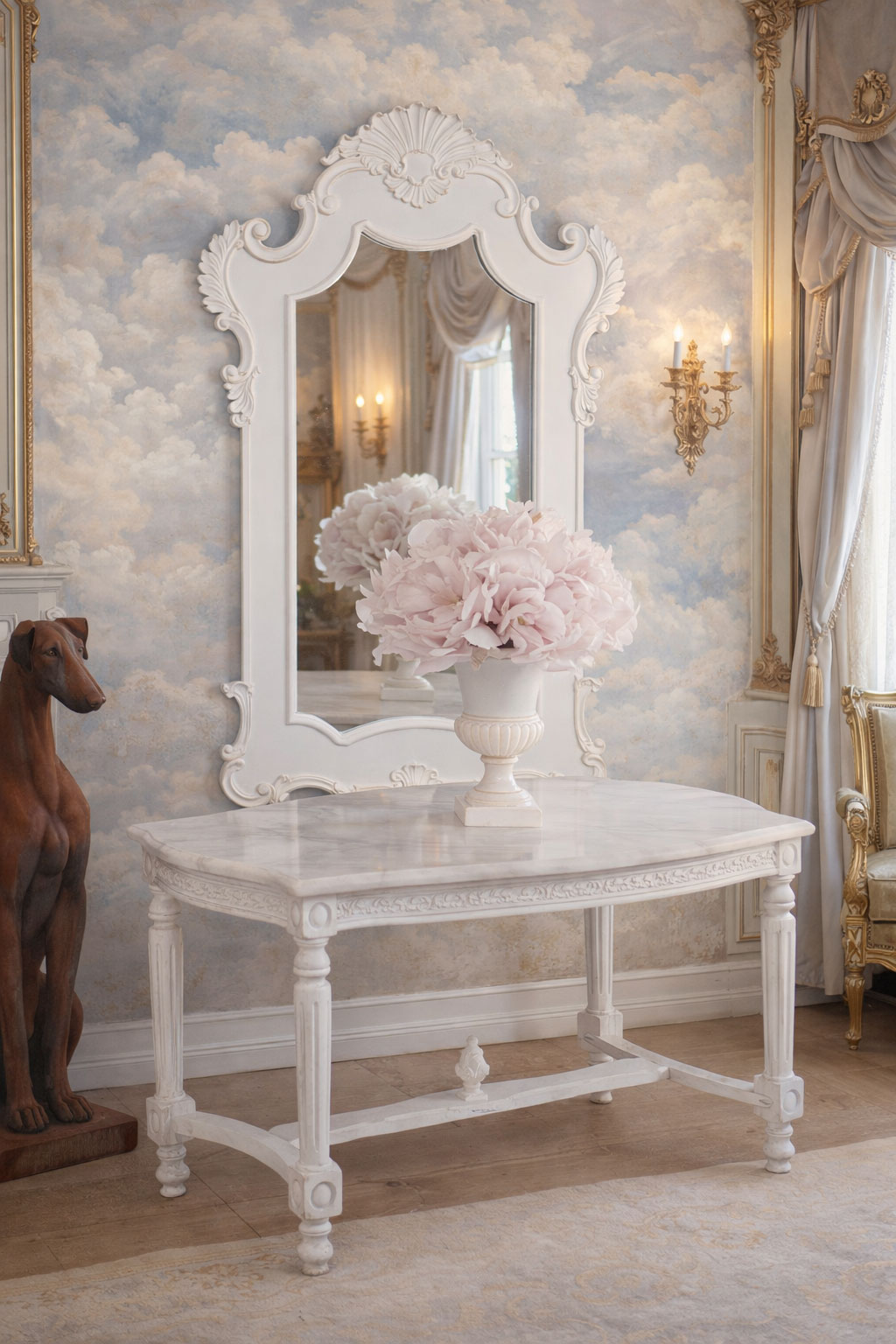 Der romantische Spiegel „Villa Judith“ ist ein stilvolles Wohnaccessoire im nostalgischen Landhausstil und verleiht jedem Raum eine warme, charmante Atmosphäre.