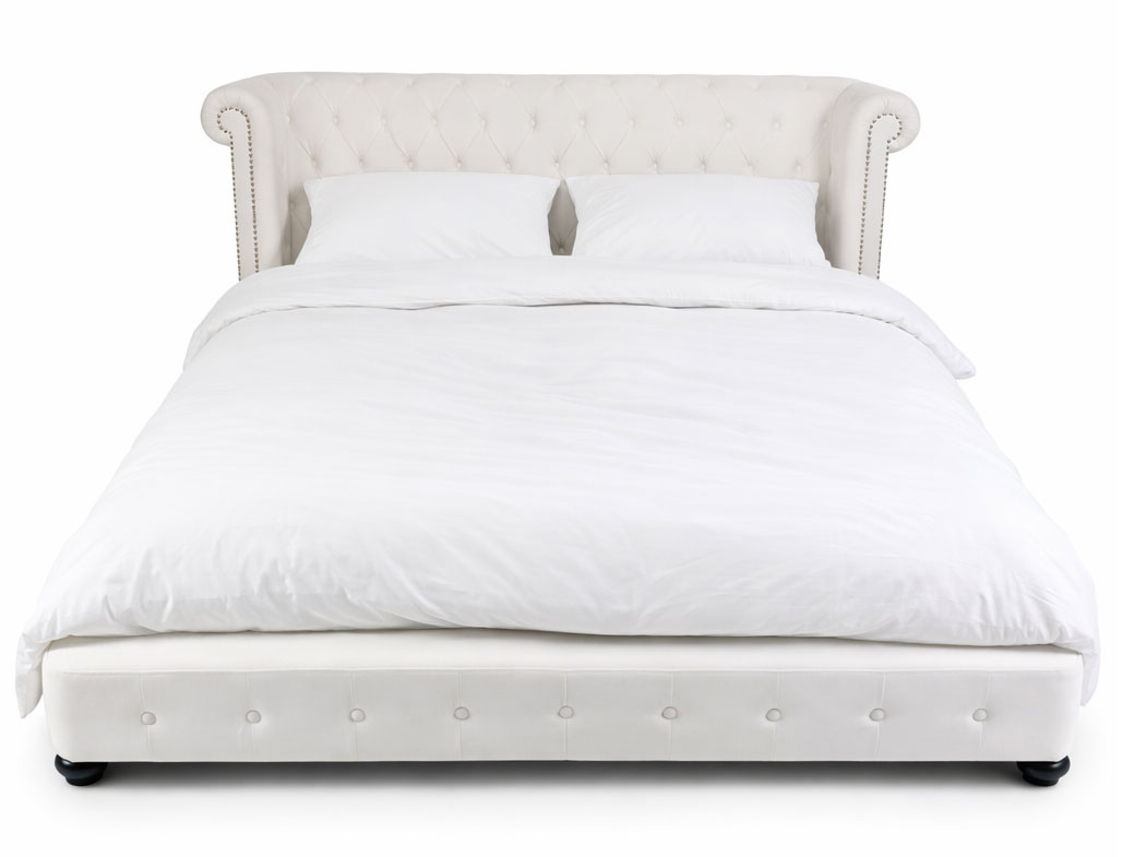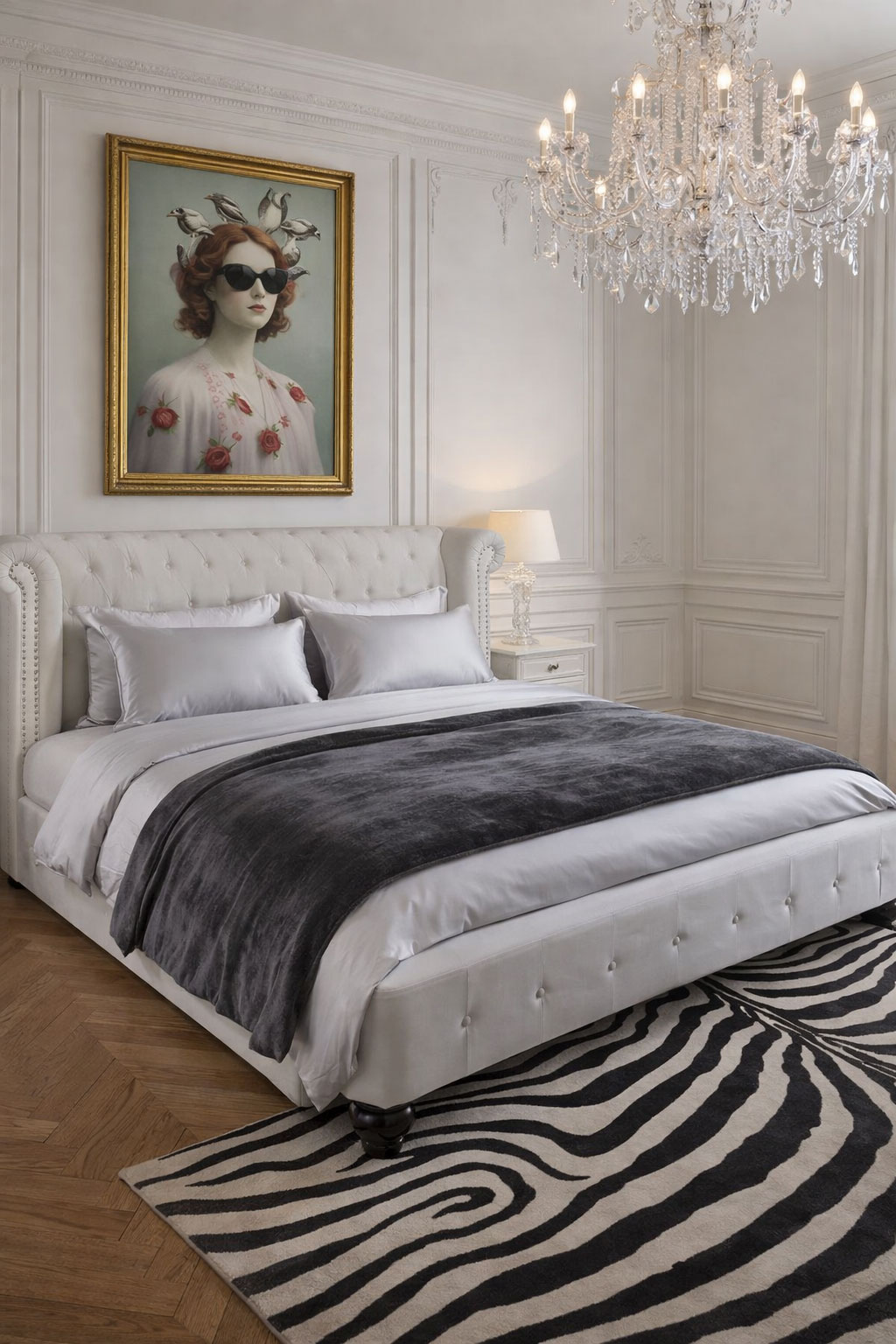 Das Bett „Chateau Marmont“ vereint samtigen Luxus, markante Chesterfield-Steppung und englische Eleganz zu einem royalen Vintage-Statement für stilvolle Schlafzimmer.