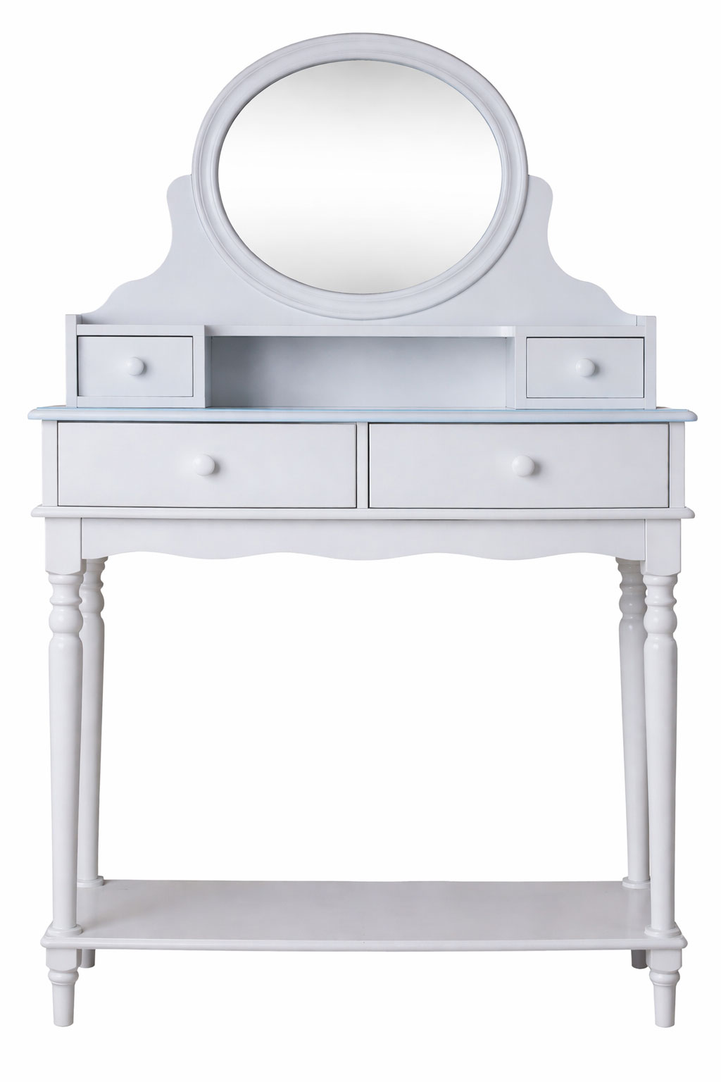 Der schlichte, harmonisch proportionierte Korpus wird durch praktische Stauraumlösungen ergänzt: Zwei kleine sowie zwei großzügige Schubladen bieten ausreichend Platz für Kosmetik, Schmuck und persönliche Accessoires. Der elegant aufgesetzte Spiegelaufsatz rundet das Gesamtbild funktional wie optisch ab und macht den Tisch zum perfekten Begleiter für die tägliche Pflege und Styling-Routine.