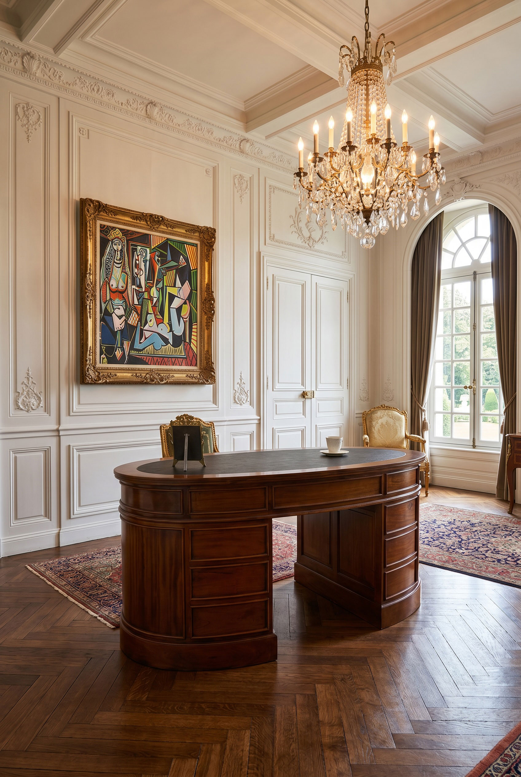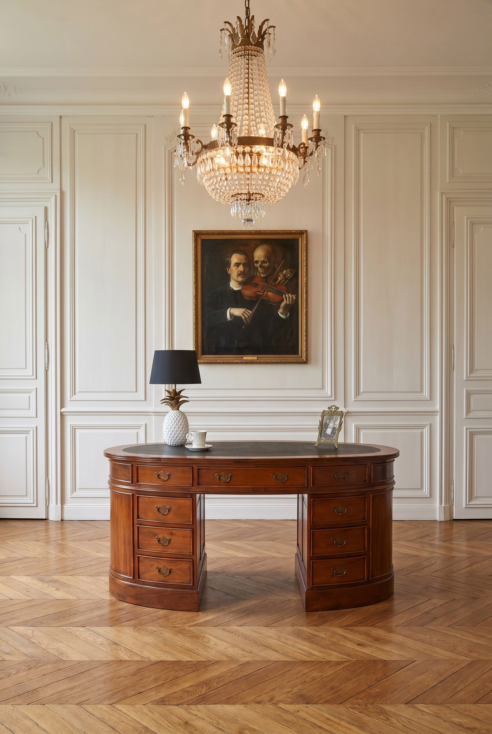 Der Massivholz Schreibtisch „Regency“ ist ein edles Stilmöbel im klassischen englischen Antik Stil und vereint zeitlose Eleganz mit hochwertiger Handwerkskunst. Gefertigt aus massivem Mahagoniholz, strahlt dieser Schreibtisch eine warme, luxuriöse Atmosphäre aus und wird zum repräsentativen Mittelpunkt in jedem Arbeitszimmer.