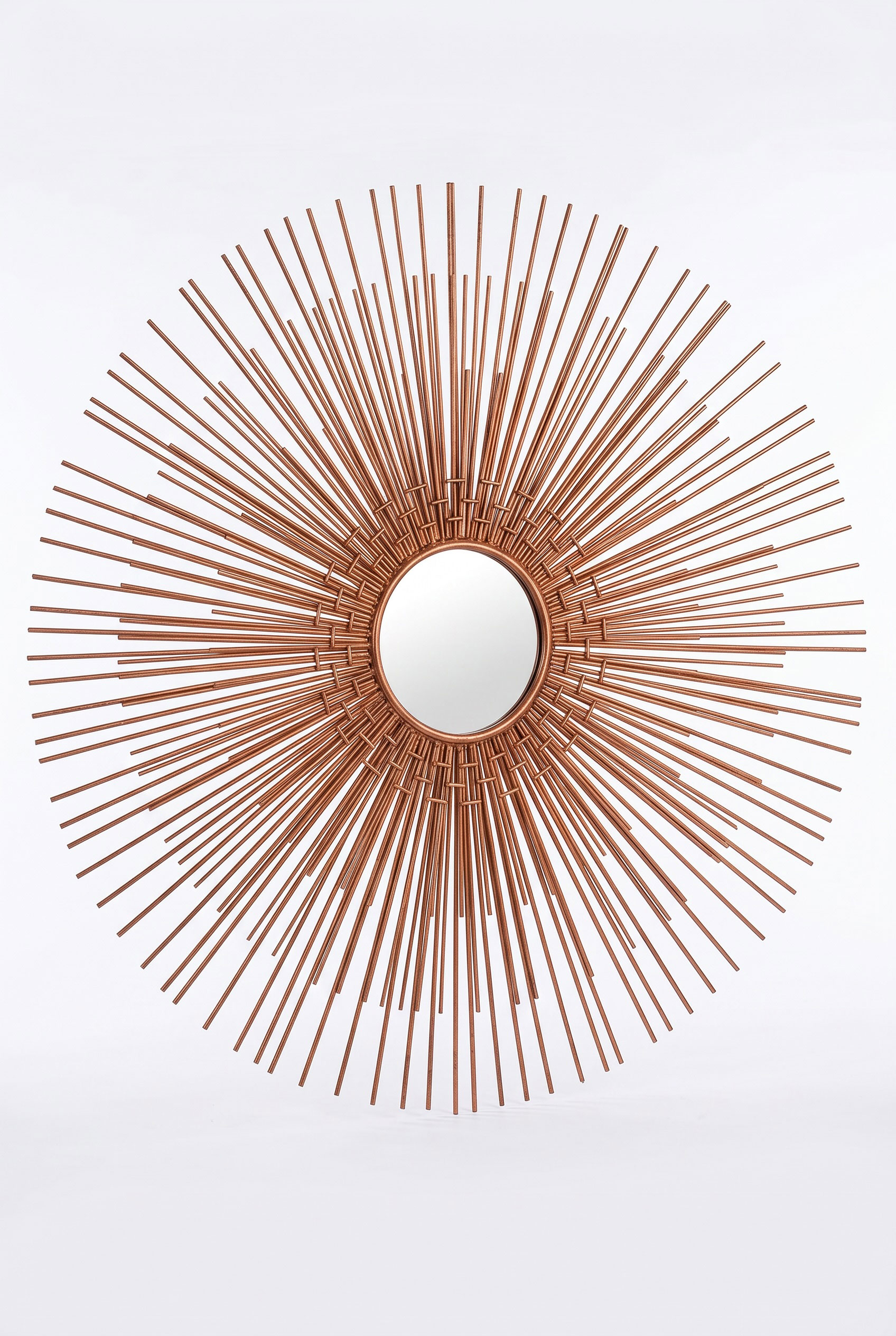 Gefertigt aus robustem Metall und in einer edlen Kupferoptik gehalten, besticht der Spiegel durch seine warme Ausstrahlung und seine fein abgestimmte antikisierte Patina. Die kunstvoll gestalteten Strahlen, die sich rund um das zentrale Spiegelglas anordnen, erinnern an prachtvolle Sonnendarstellungen historischer Schlossinterieurs und verleihen dem Objekt eine dynamische, lebendige Wirkung.